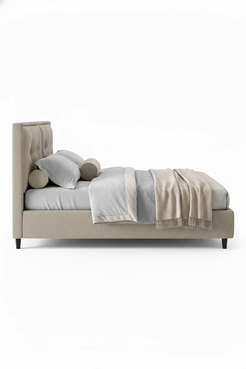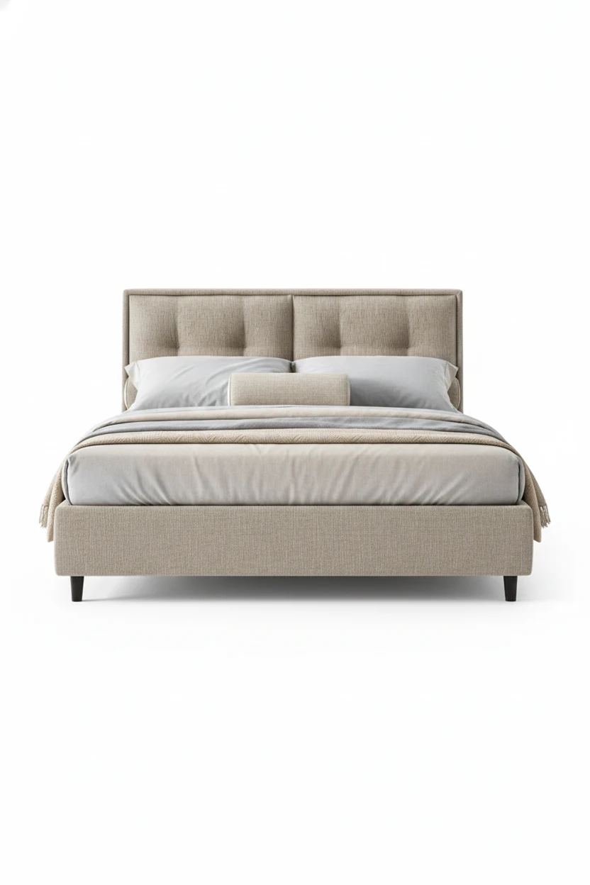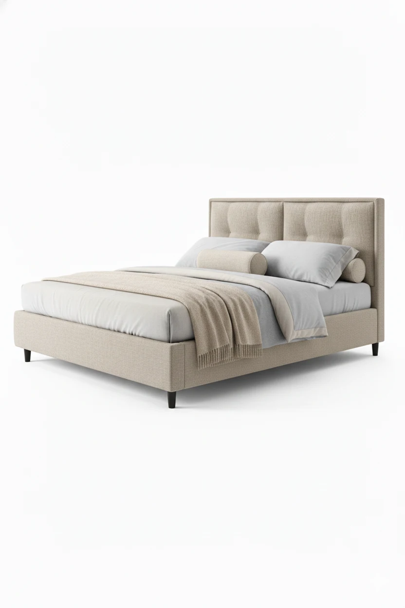 This refined bed features a classic tufted design, with a high headboard that exudes sophistication and comfort. The soft fabric and structured tufting make the bed an eye-catching centerpiece for any bedroom. The neutral tones ensure it blends effortlessly with various decor styles, adding a touch of elegance and modern charm to your space.