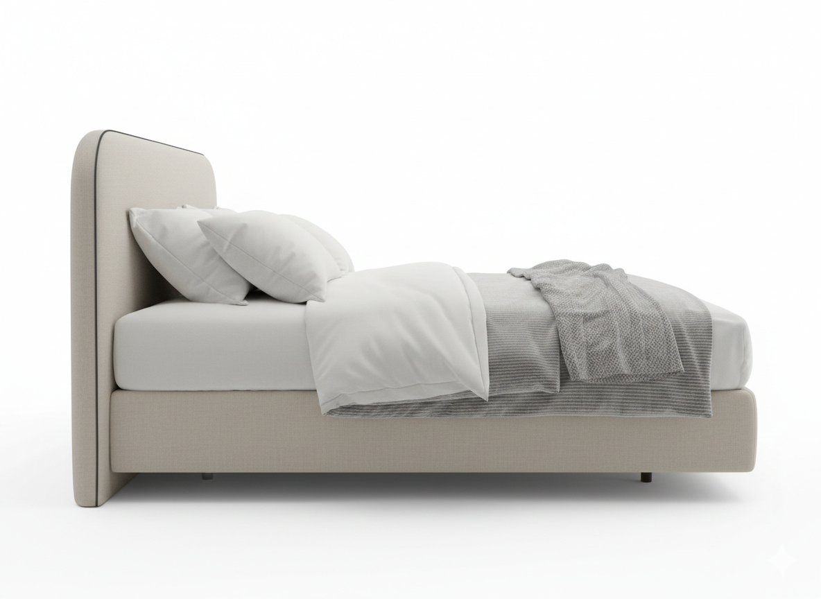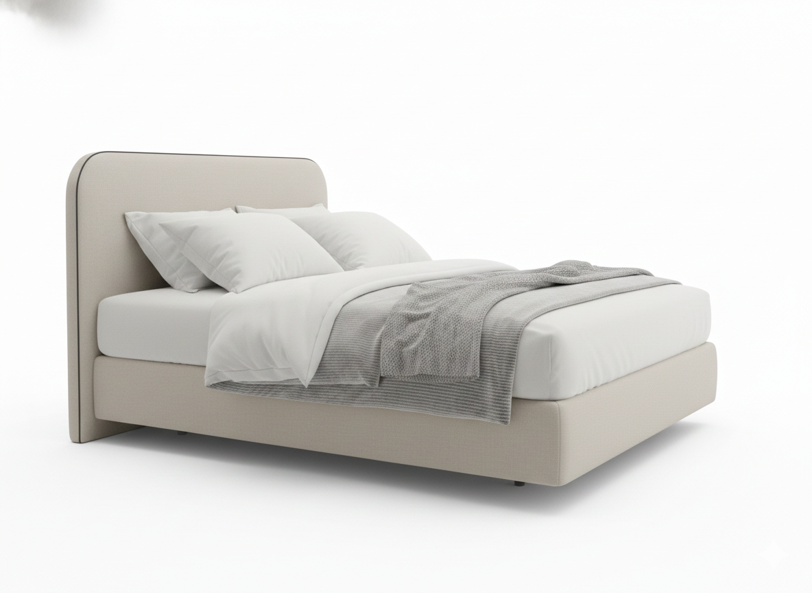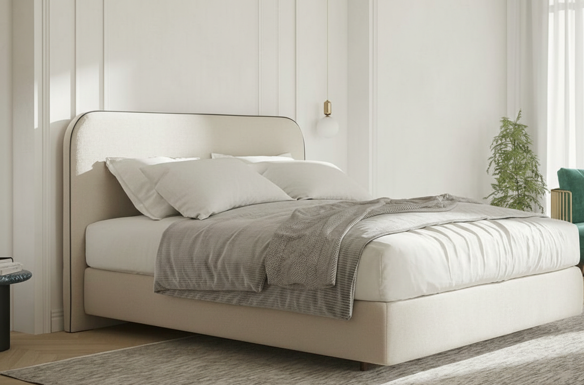 If you love the “less is more” vibe, this bed is a total game-changer for your bedroom. It features a beautifully rounded, wrap-around headboard that feels like a warm hug, finished with a sharp dark piping that gives it a tailored, high-end look. The soft cream upholstery and clean lines make the whole room feel instantly brighter, calmer, and much more inviting.