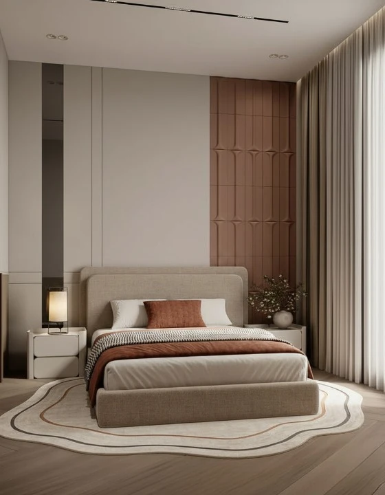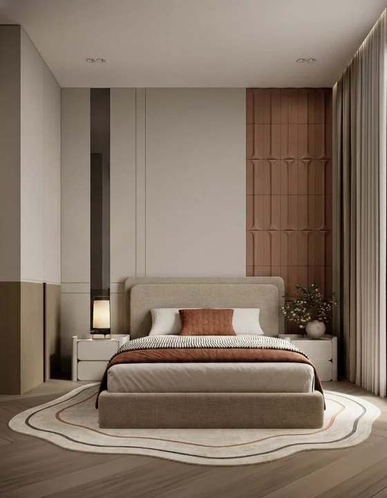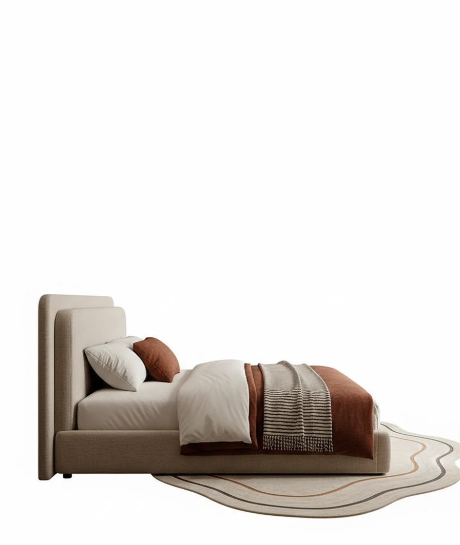 This modern bed combines comfort and aesthetics with its soft beige fabric and streamlined design. The clean lines and subtle detailing in the headboard give a calm and peaceful vibe, making it a perfect fit for creating a cozy and serene bedroom environment. The textured rug and simple decor complement the bed, enhancing the overall stylish yet minimalistic look.