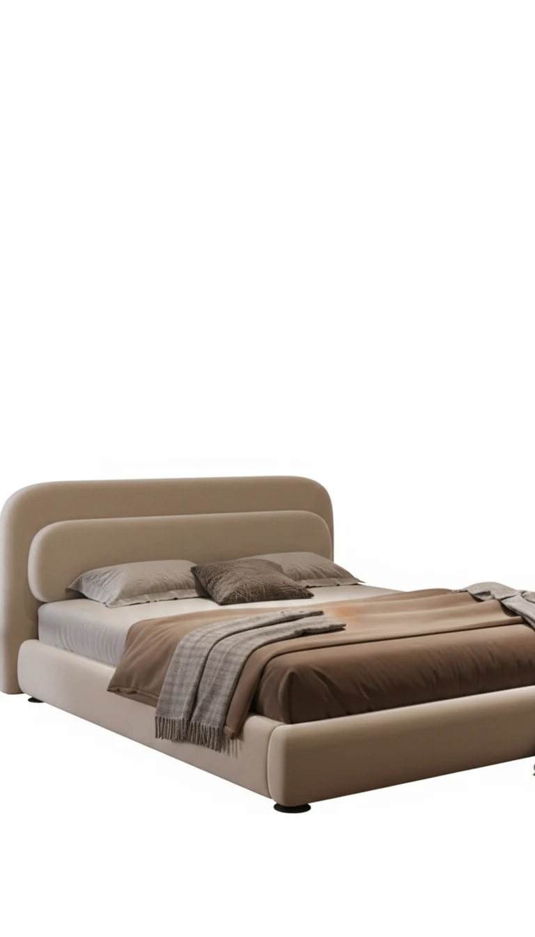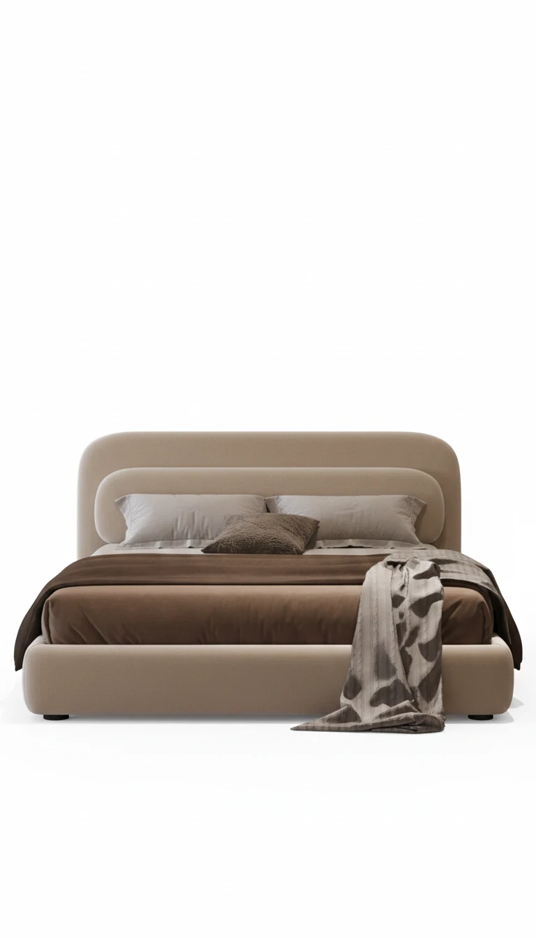This luxurious bed combines a soft, rounded headboard with a smooth, sleek frame, making it the perfect blend of comfort and style. Its elegant curves are complemented by a neutral, earthy color palette that exudes warmth and relaxation, creating a welcoming atmosphere in your bedroom. The plush fabric and soft, cozy feel make it the ideal spot to rest and recharge.