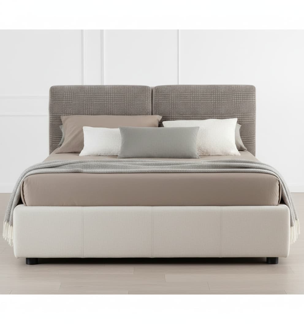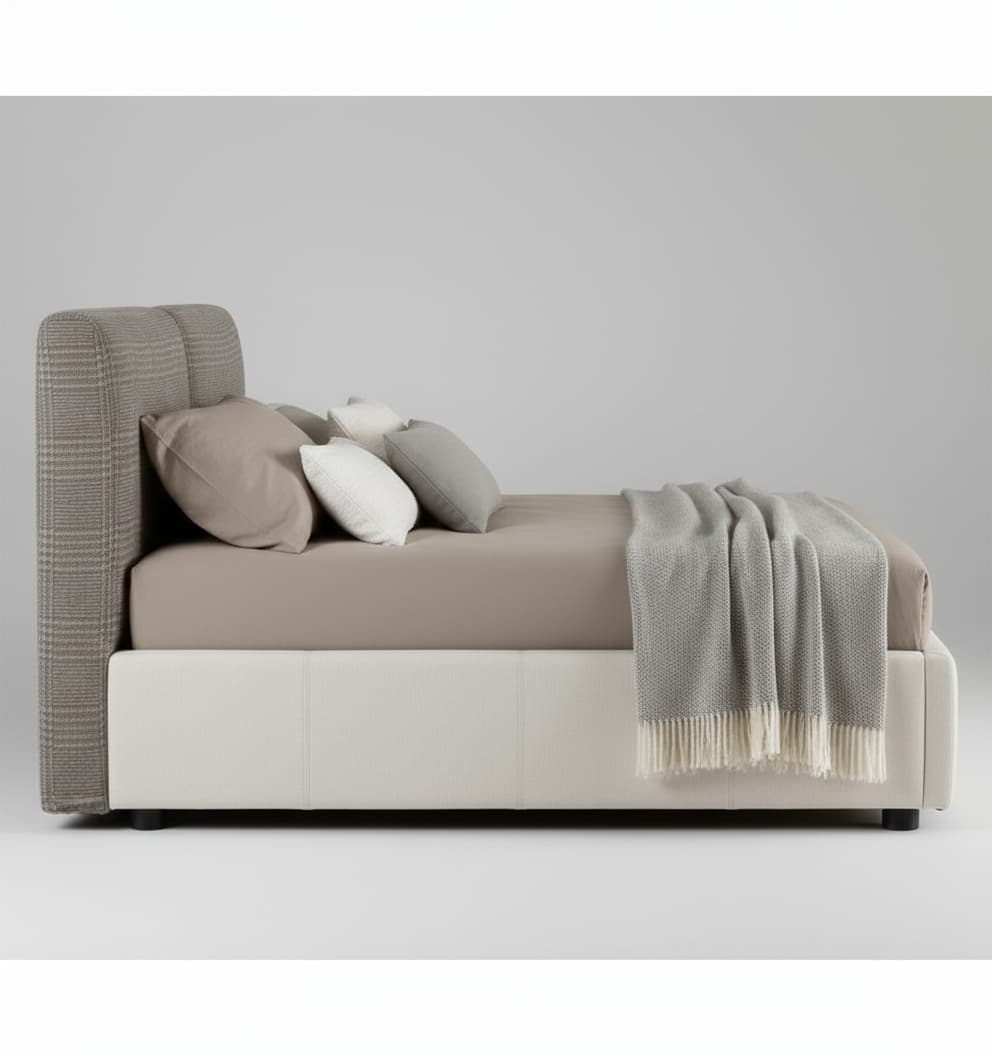 This beauty catches your eye with its plush gray textured fabric headboard that’s split into two comfy sections, perfect for leaning back with pillows.