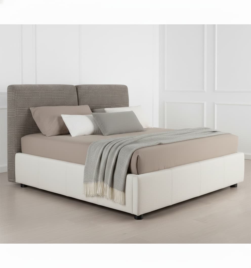 The crisp white leather base lifts it up on slim legs, making the room feel bigger and brighter. Paired with soft beige sheets and those fluffy pillows, it screams relaxed evenings in style.