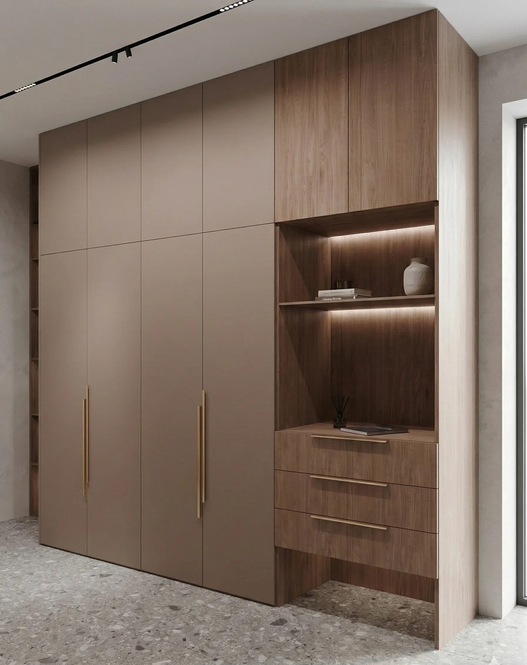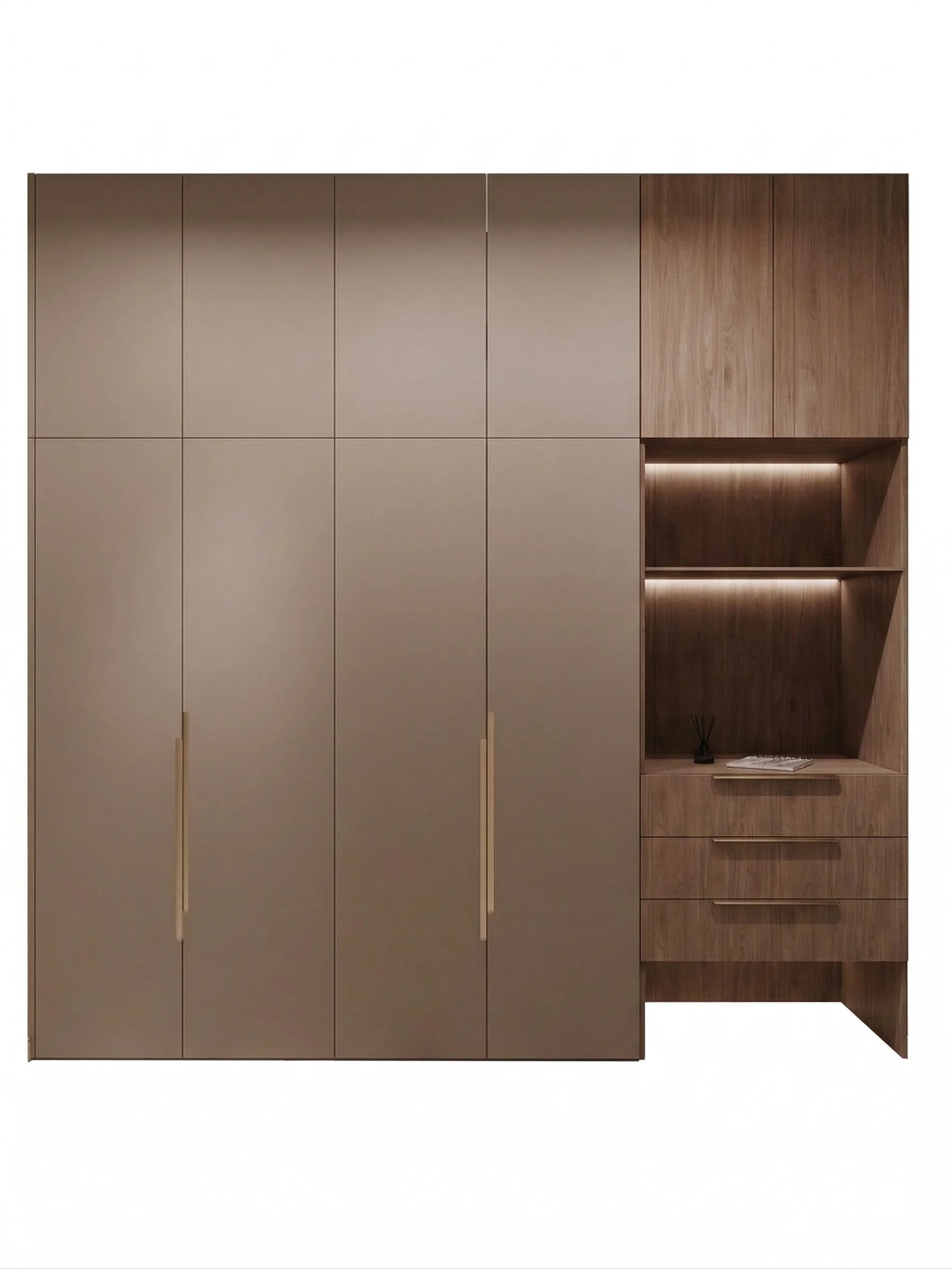 The advanced anti-fingerprint matte surface is paired with durable walnut-grain laminates and warm LED accents for a premium feel. Featuring 4 precision-swing doors and integrated overhead lofts, this wardrobe is the definitive storage solution for modern Indian master suites.