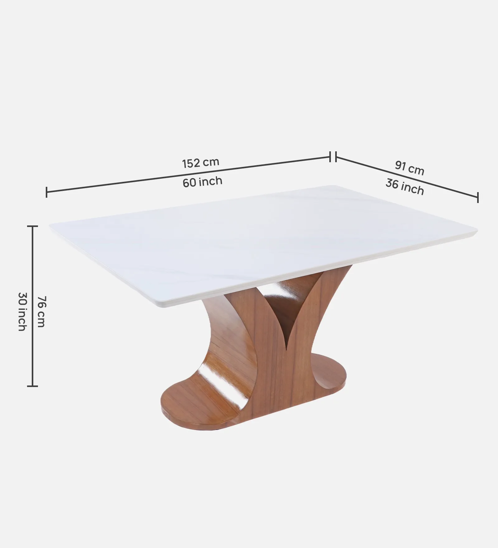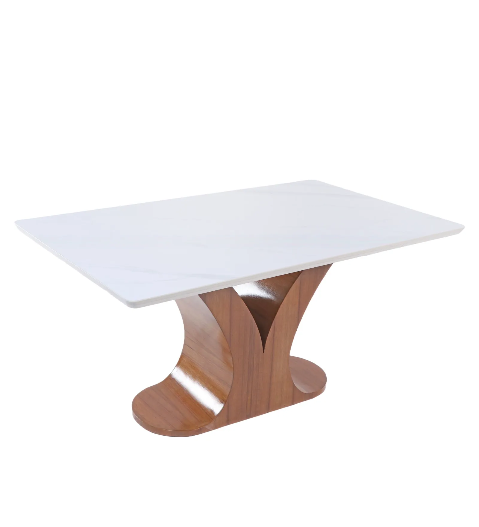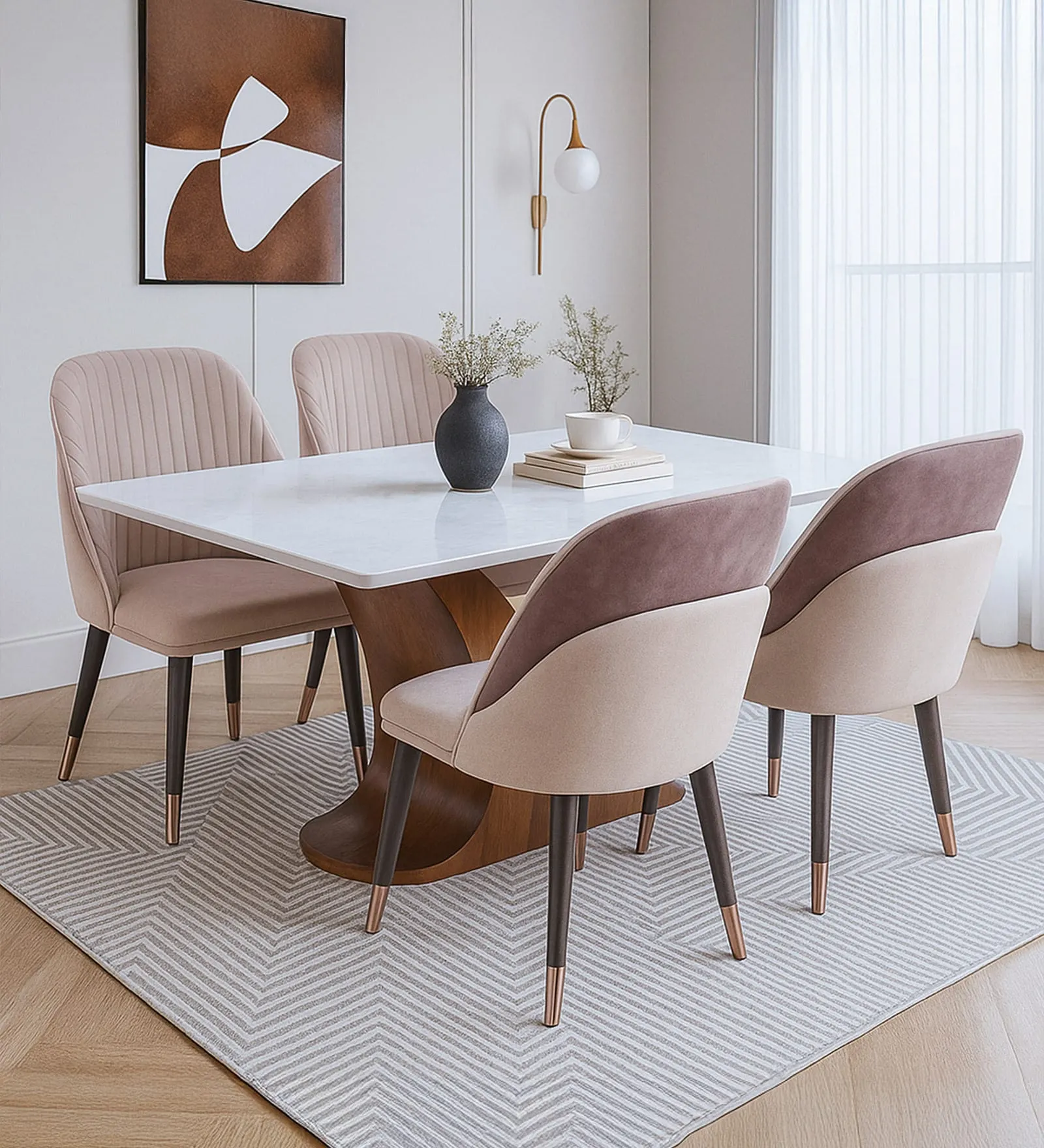 This dining set is all about that “modern yet classy” vibe. It features a beautiful white marble-finish tabletop that instantly brightens up your dining area. The table is supported by a unique, sculptural wooden base in a rich walnut finish, giving it a very sturdy and high-end look.