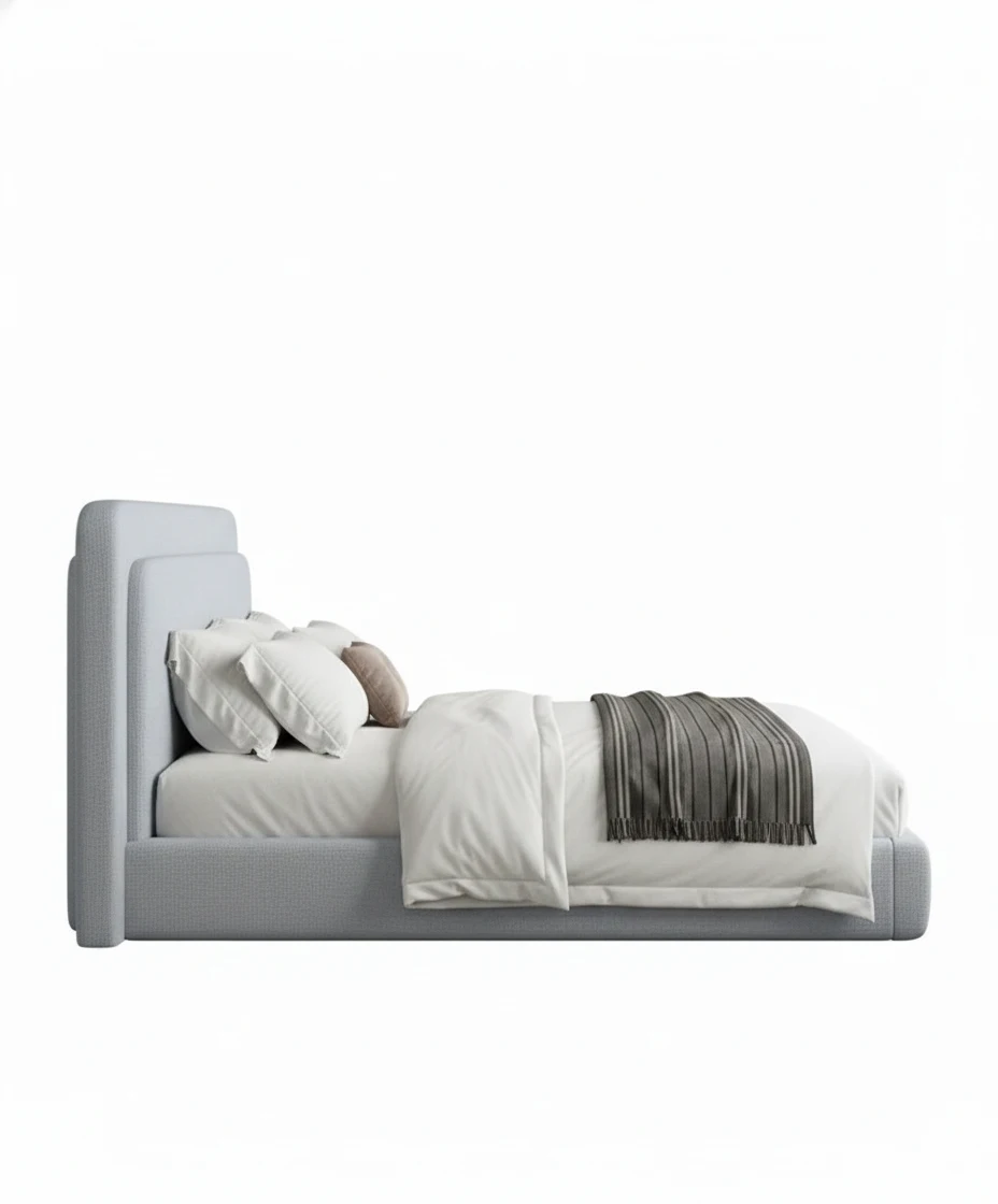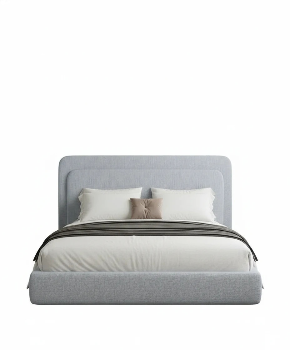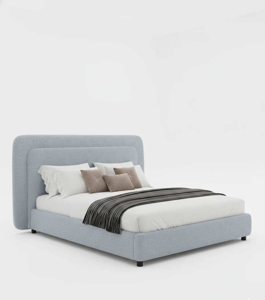 This stylish bed features a beautifully curved headboard, adding a touch of elegance to your bedroom with its soft, soothing design. The gentle curves are complemented by the light, textured fabric, making it an ideal choice for those who appreciate minimalist yet luxurious design. The bed’s simple silhouette and neutral color make it versatile enough to match a variety of bedroom themes.