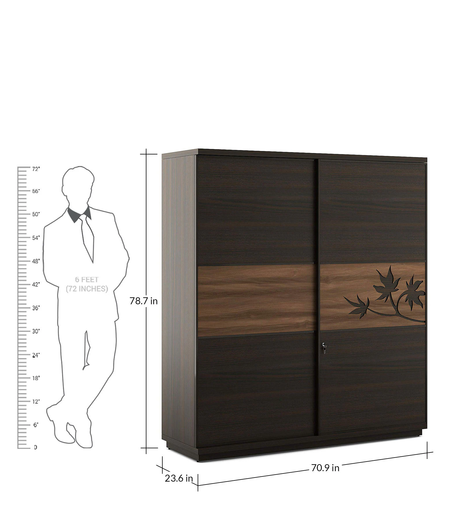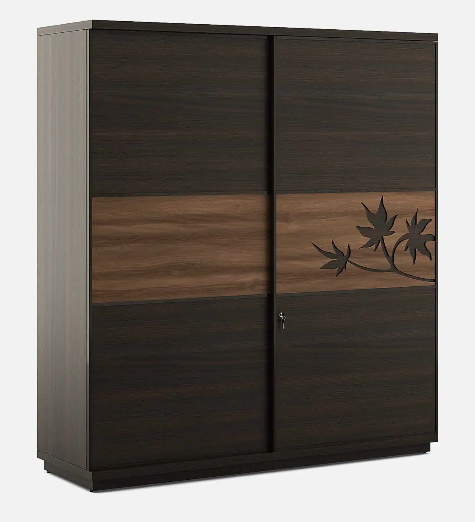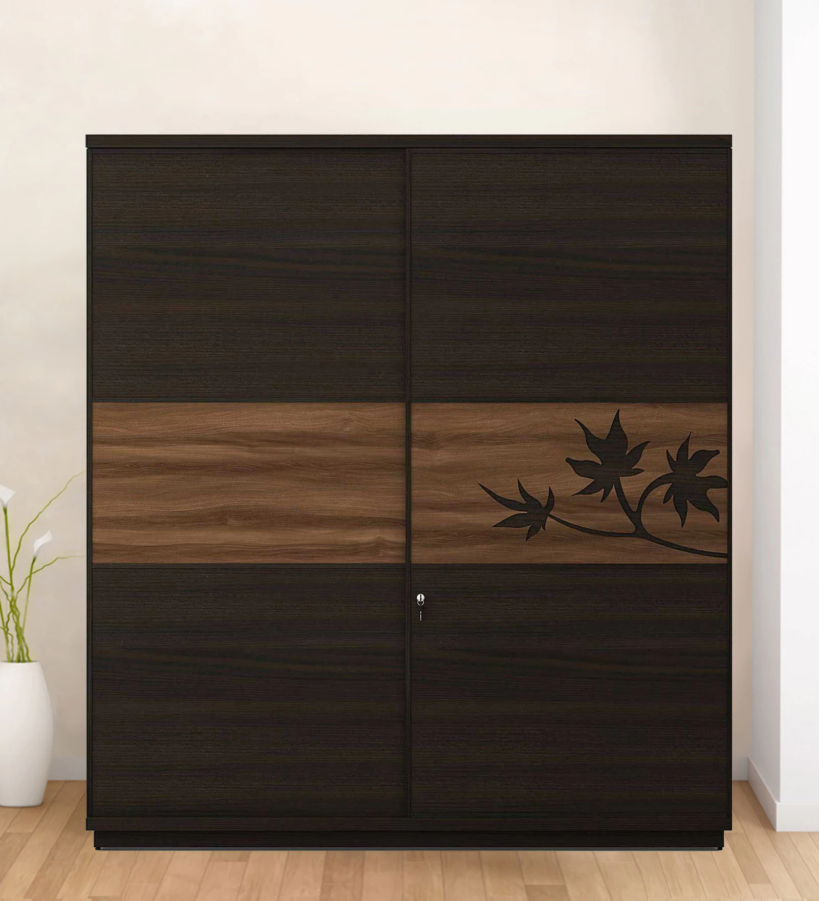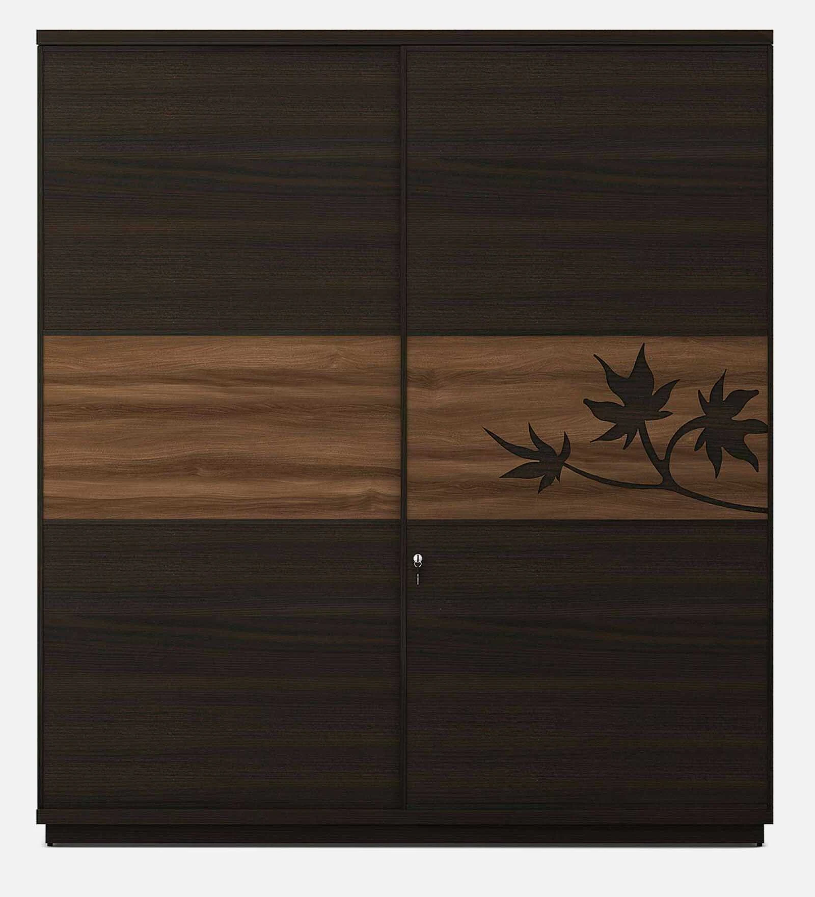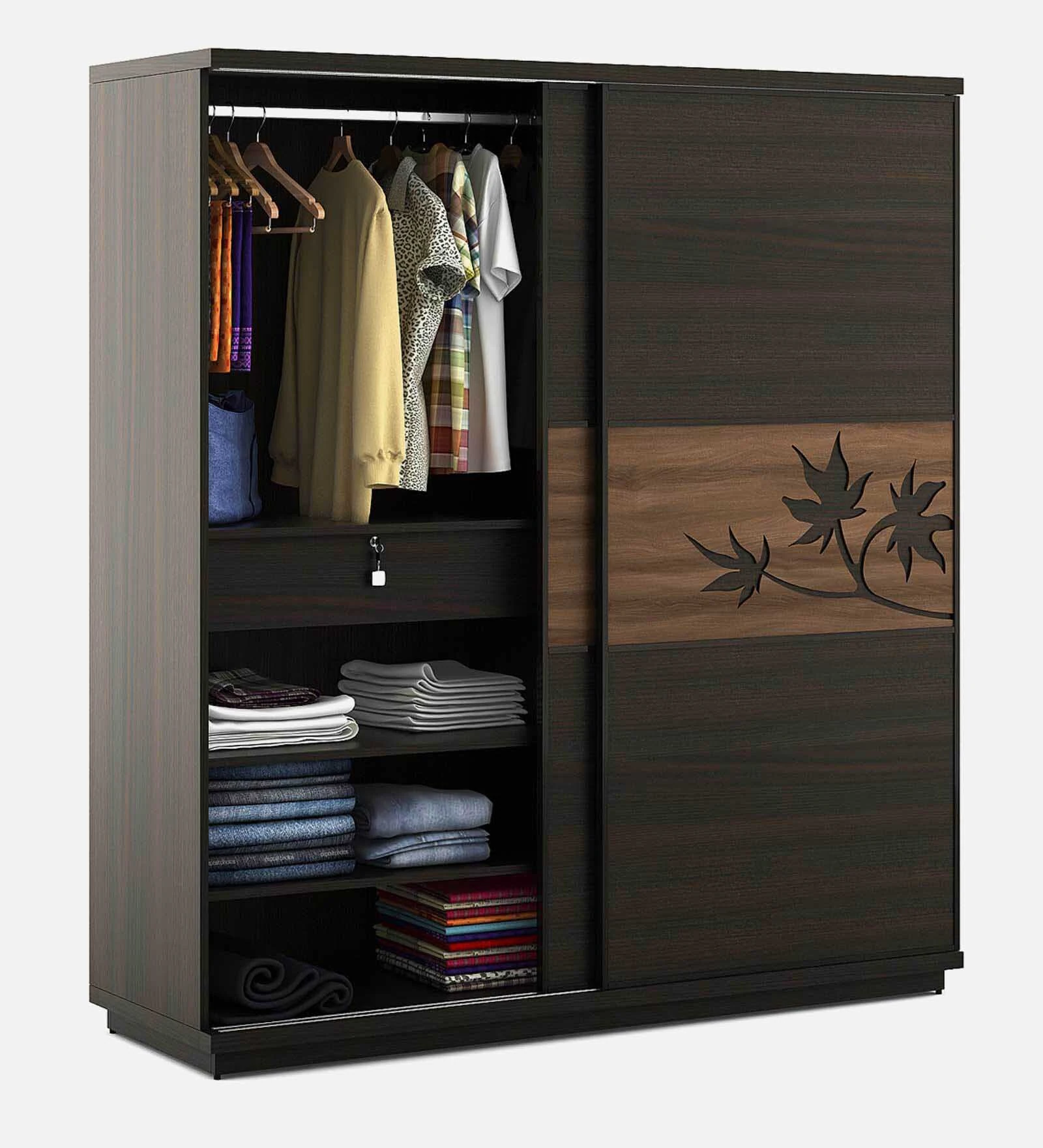 Elegant Walnut Finish Sliding Door Wardrobe with Leaf Motif