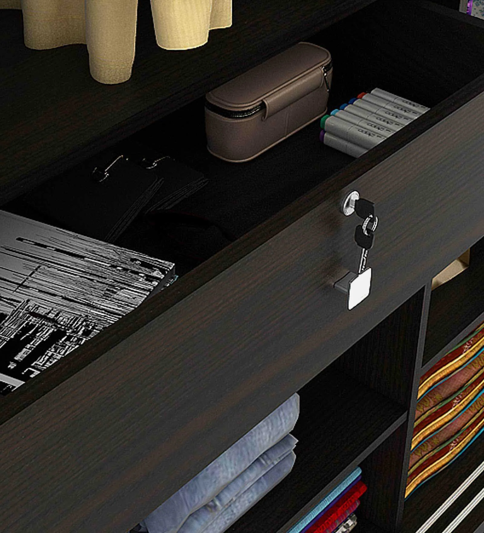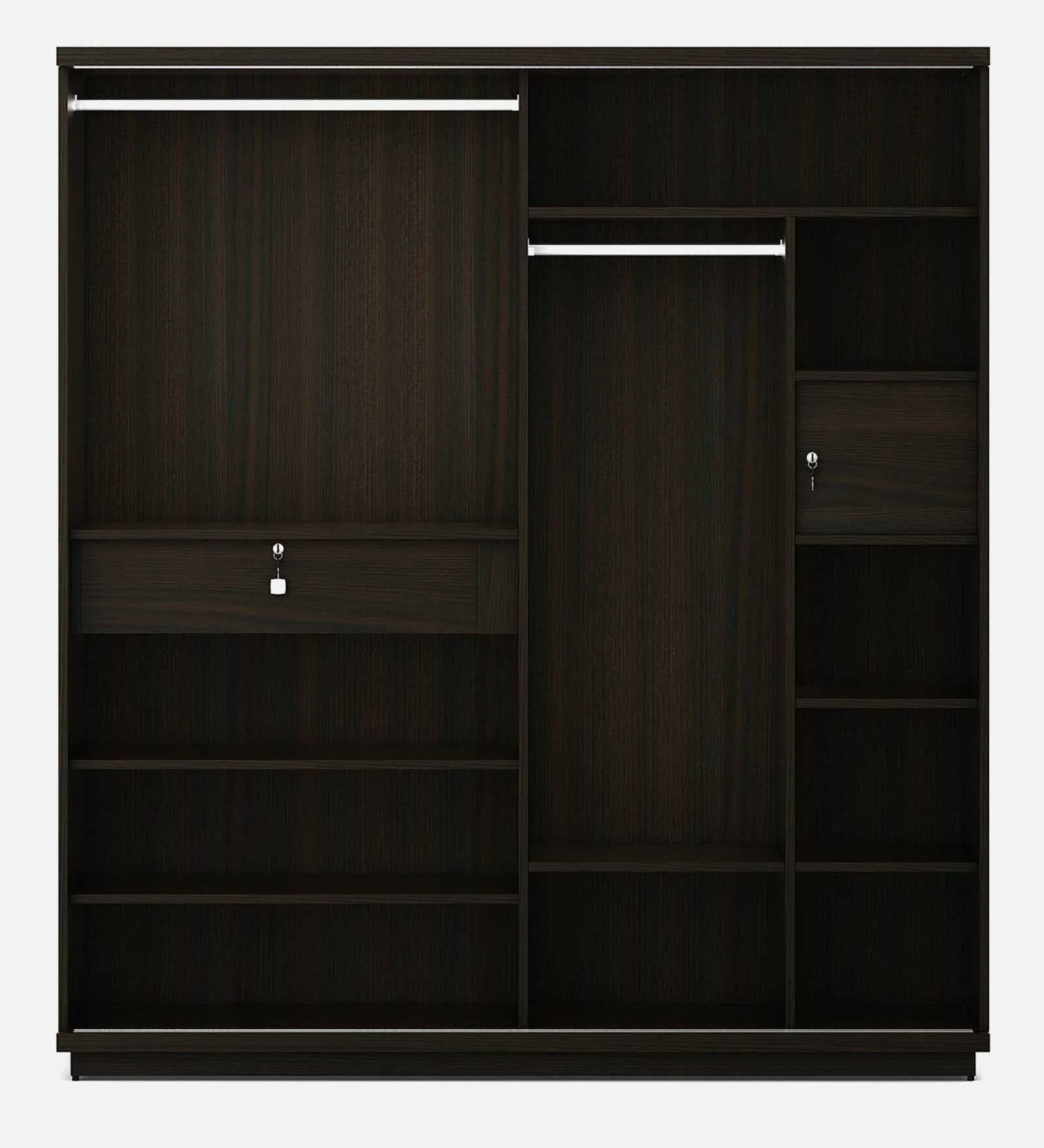 This sliding door wardrobe is a great space-saver for smaller Indian bedrooms where swinging doors might feel cramped. The deep walnut finish gives it a rich, grounded look, while the lighter wooden band in the middle adds a nice break to the dark tones.