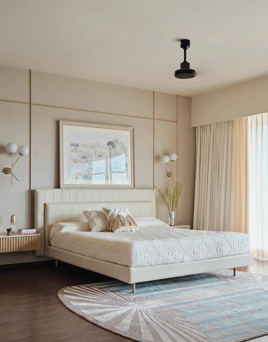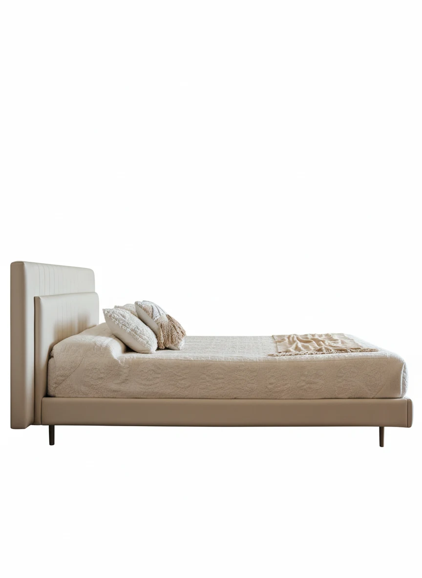 The front, lower panel remains smooth, providing a clean contrast that feels incredibly balanced. Dressed in a creamy off-white upholstery, it has a “quiet luxury” vibe that instantly makes a bedroom feel like a five-star suite.