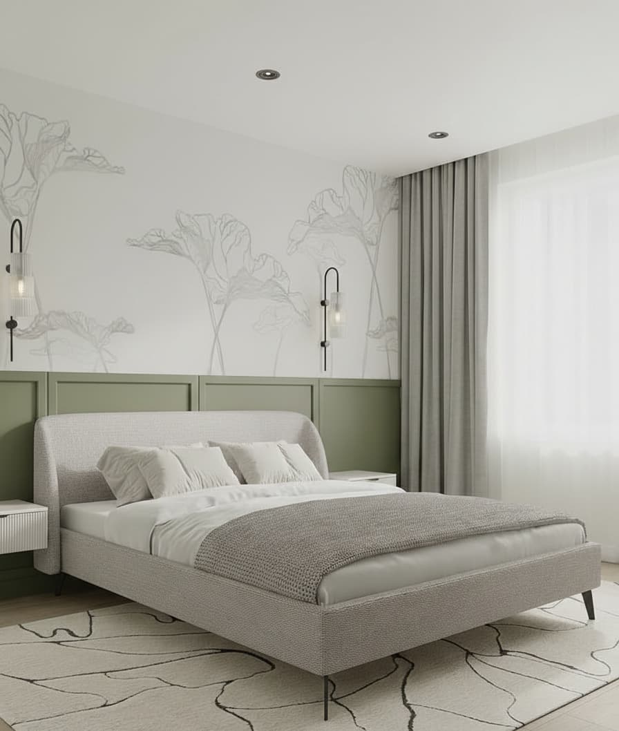 This one’s a soft beauty with its curved light gray fabric headboard that wraps around like a cozy hug, set against plain walls or that green panel for a fresh twist. White sheets topped with fluffy pillows and a neutral throw keep it simple and clean, all on slim black legs that make the room feel bigger. Those curved edges add a gentle flow, perfect for relaxed mornings.