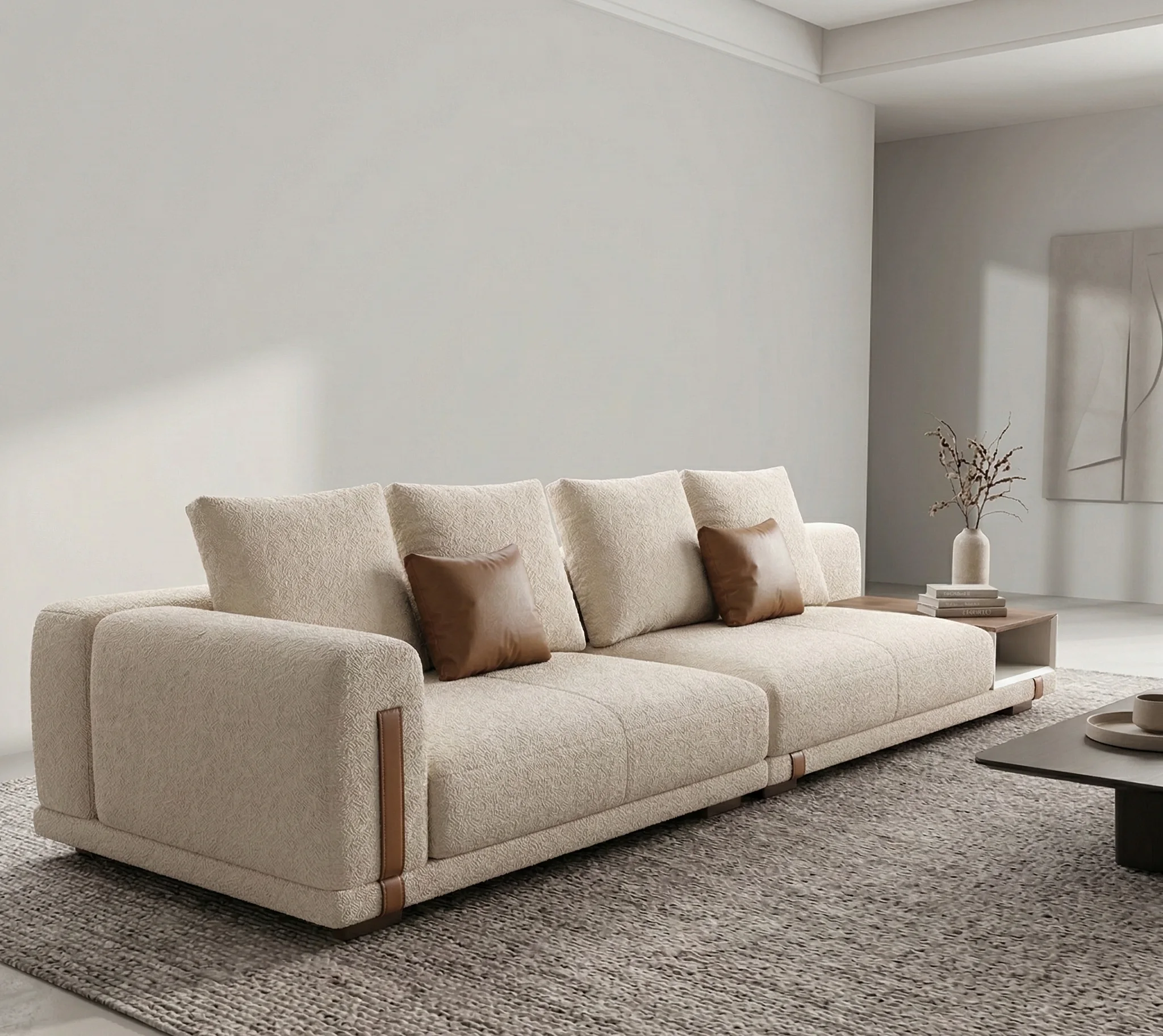 The sofa sits low to the ground with unique leather-strap accents on the frame, which gives it a grounded, architectural feel. The cream boucle-style upholstery is soft and tactile, accented by those tan bolster pillows that tie the whole look together. It’s a wide, spacious piece that feels more like a custom-built seating area than just a standard couch.