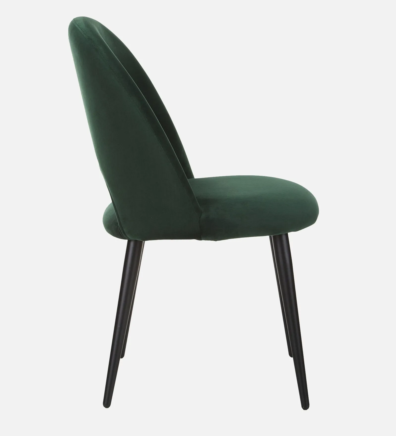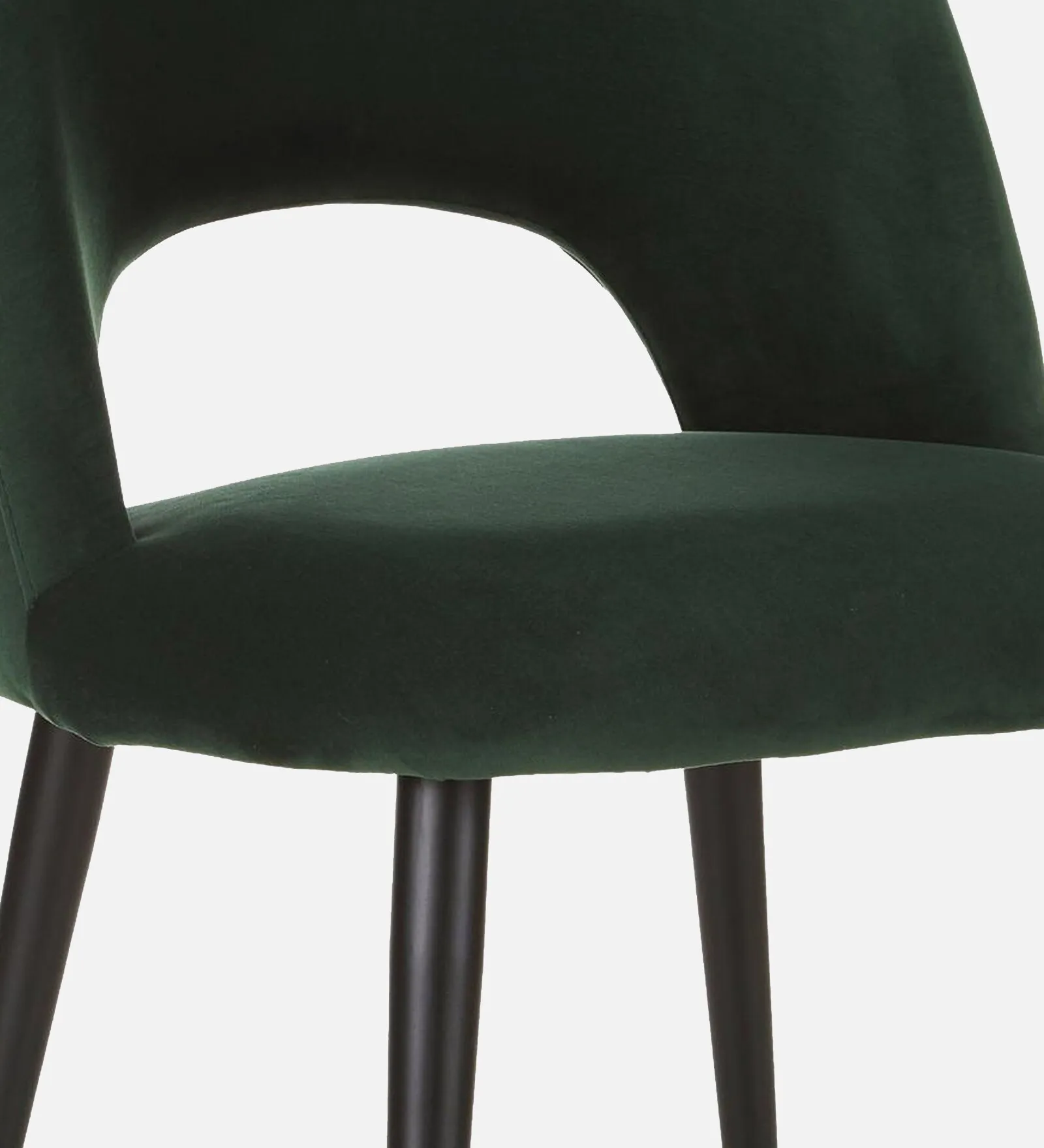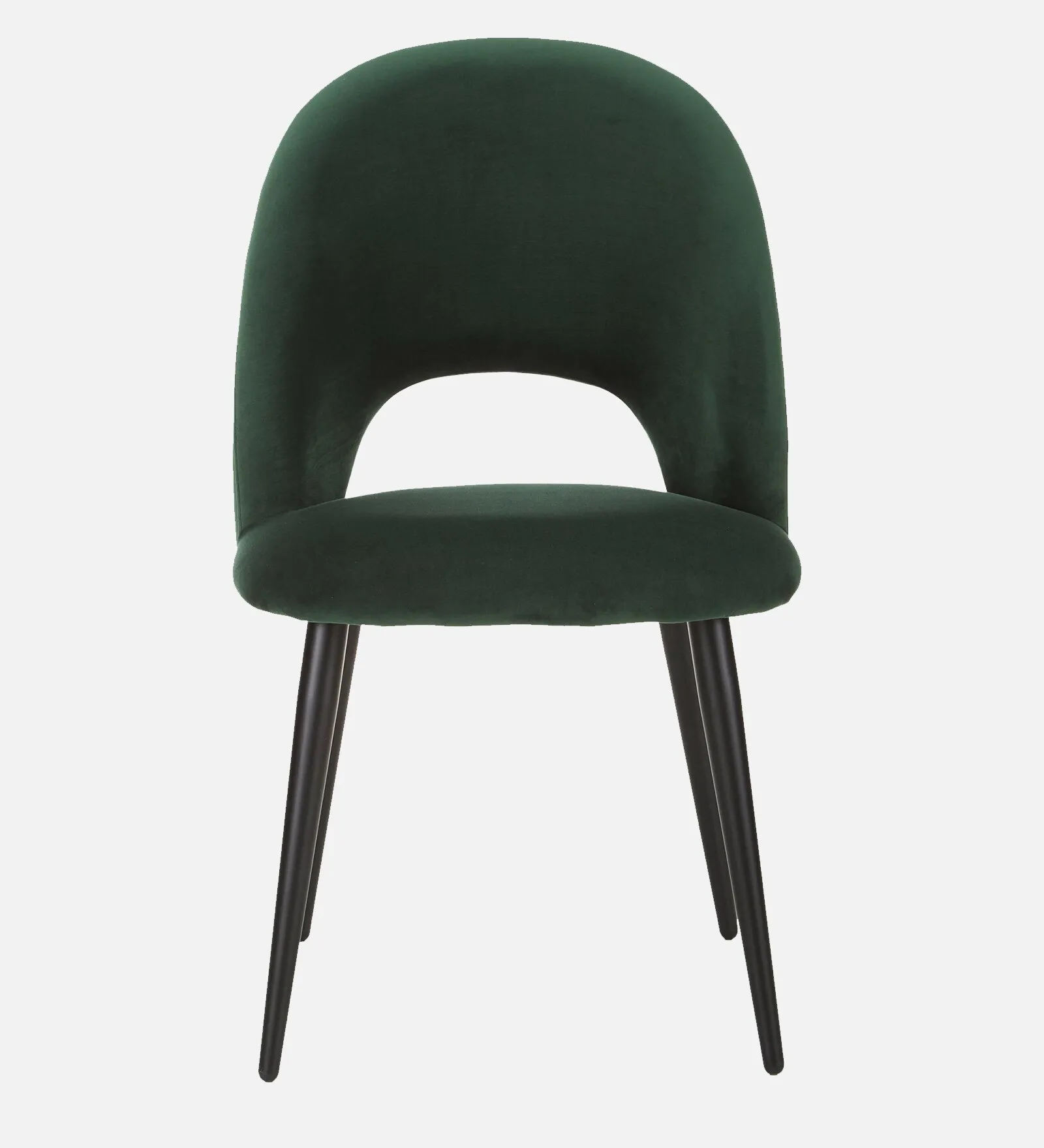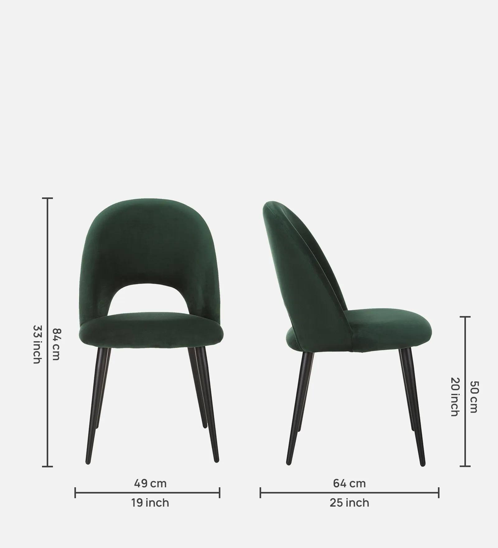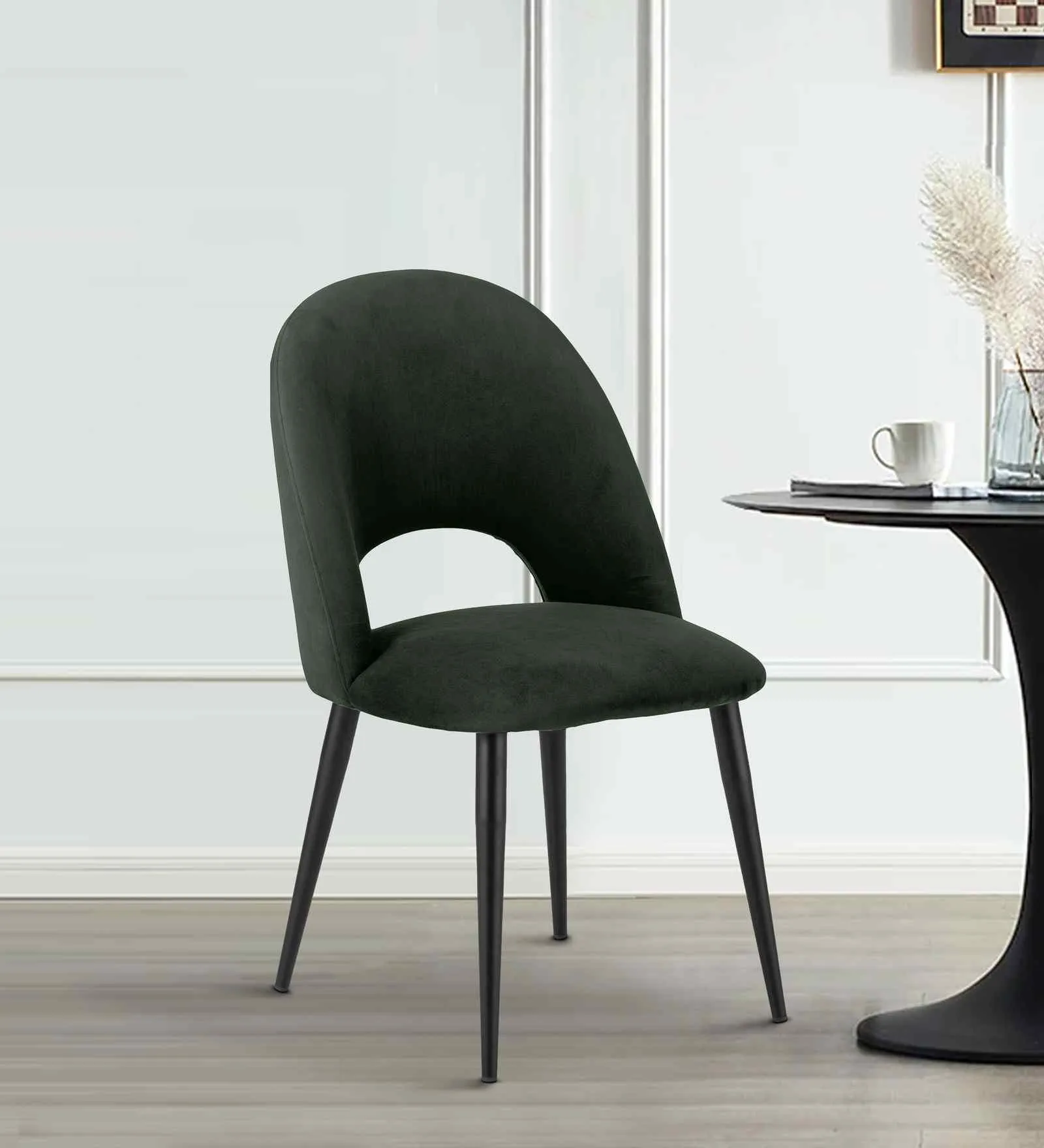 The chairs feature a rich, emerald green velvet fabric that is soft to the touch and looks stunning under dining room lights. The unique curved backrest with a stylish cutout not only adds a designer flair but also provides great support. Supported by slim, tapered metal legs with a matte black finish, these chairs are sturdy, durable, and bring a sophisticated contemporary vibe to any Indian home.