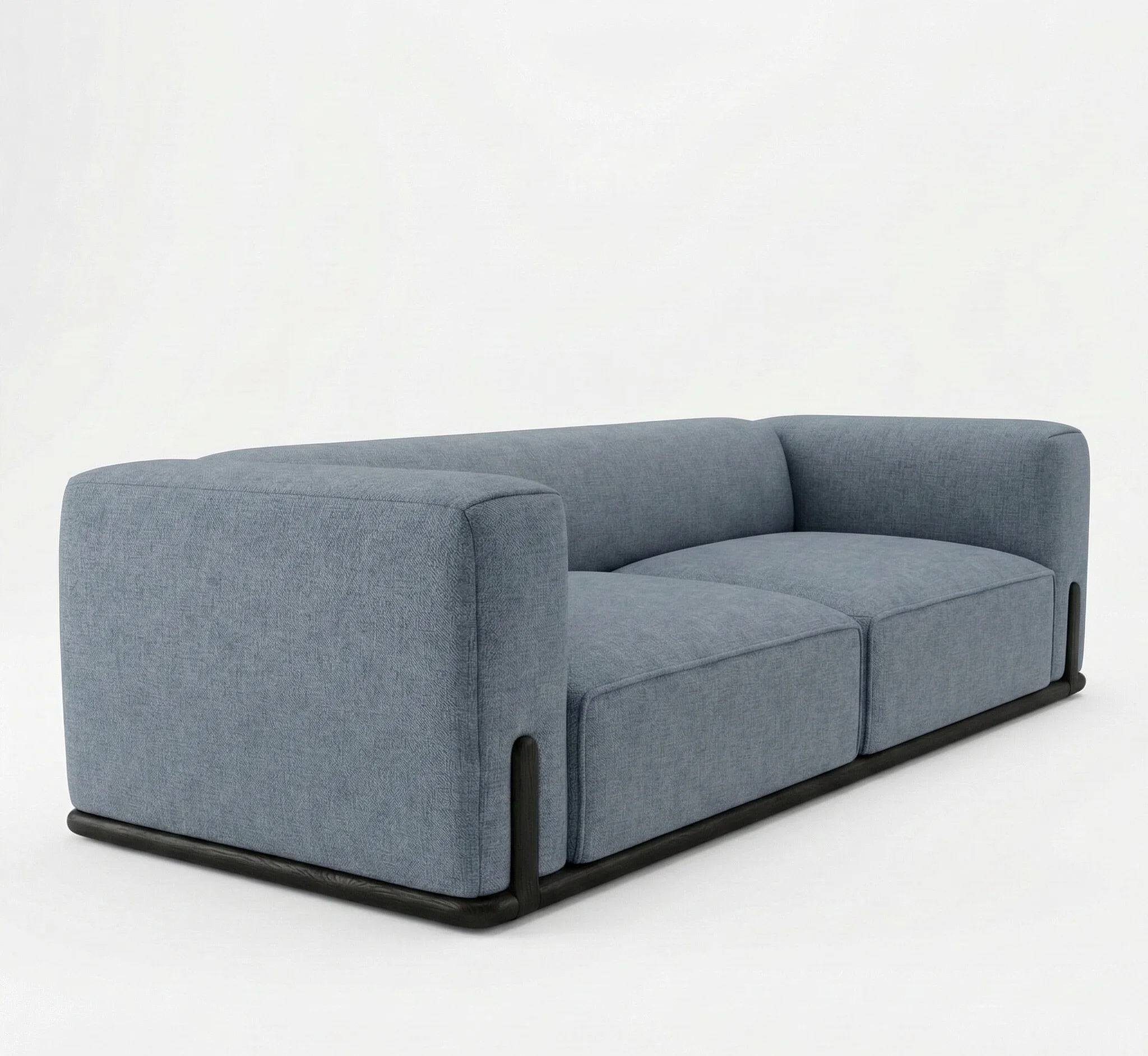 Elevate your home interior with our Denim Ash designer sofa. Perfectly blending Scandinavian warmth with modern minimalism, this piece stands out with its integrated dark wood plinth and signature corner detailing.