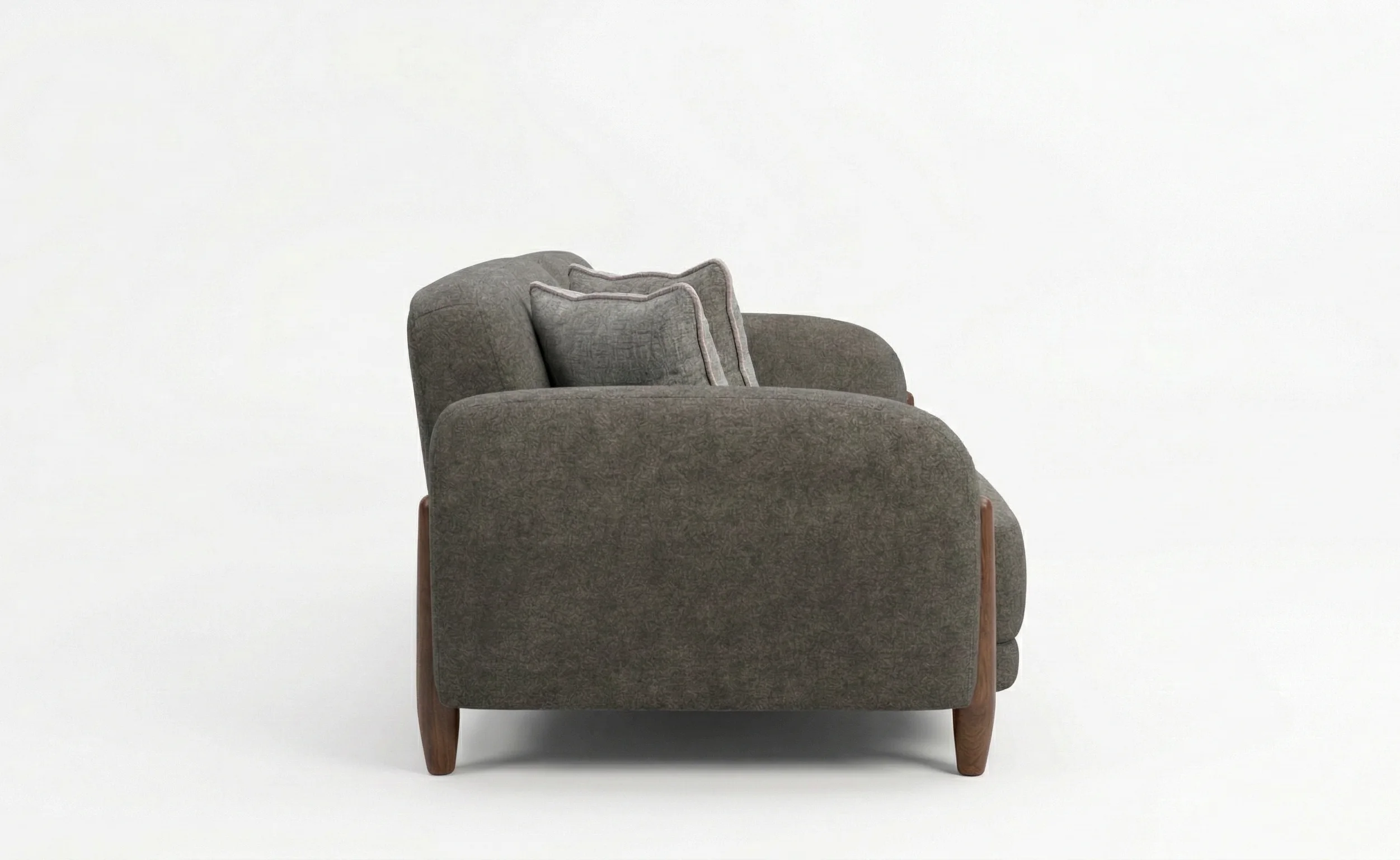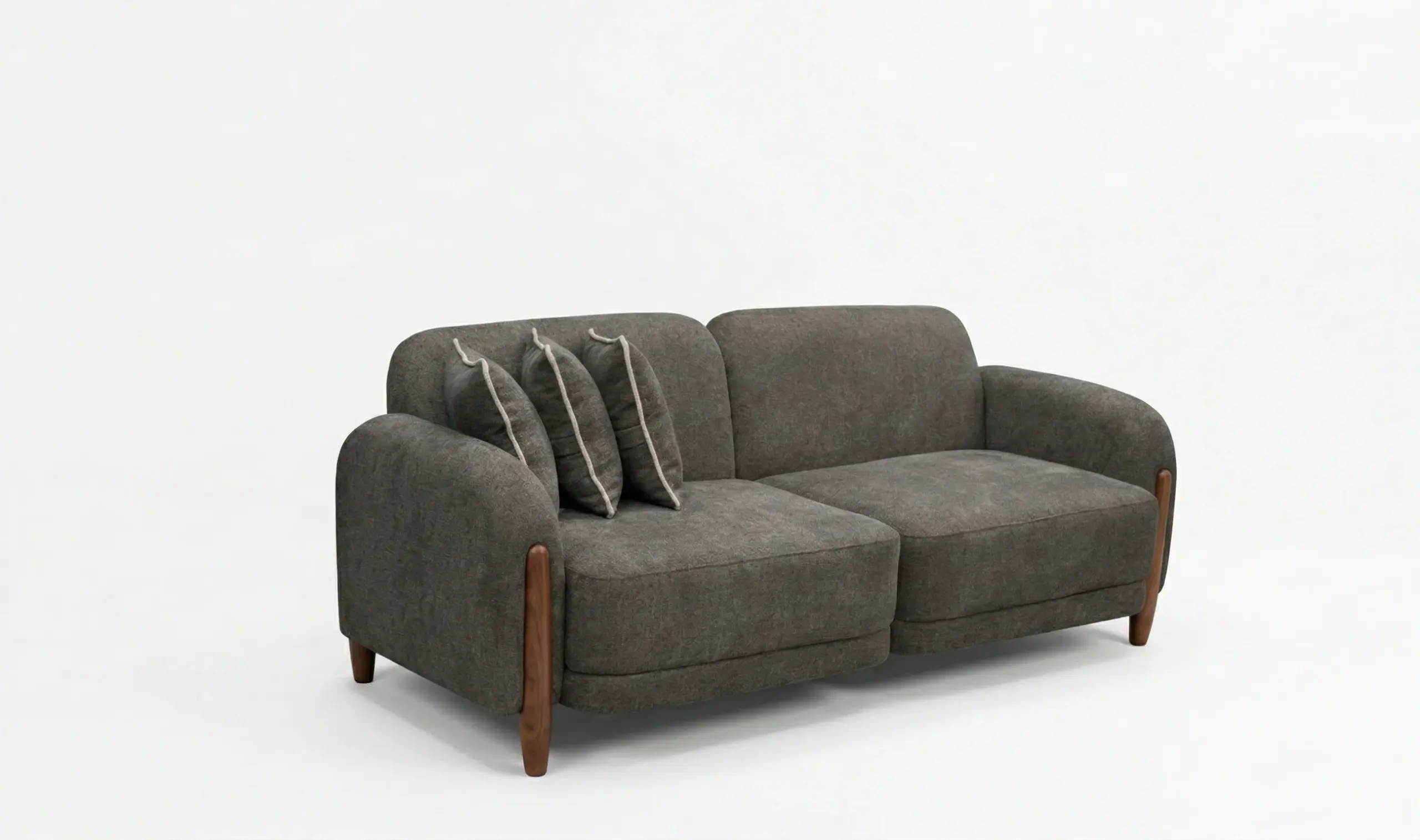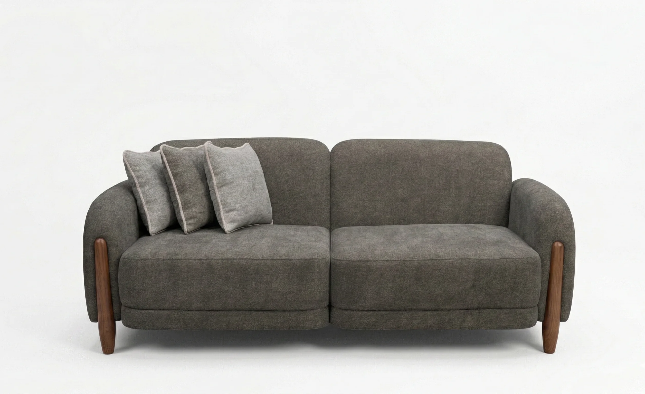 levate your home interior with our Charcoal Ash designer sofa. Perfectly blending Scandinavian warmth with modern minimalism, this piece stands out with its innovative wood-accented armrests and seamless, “puffy” cushions.