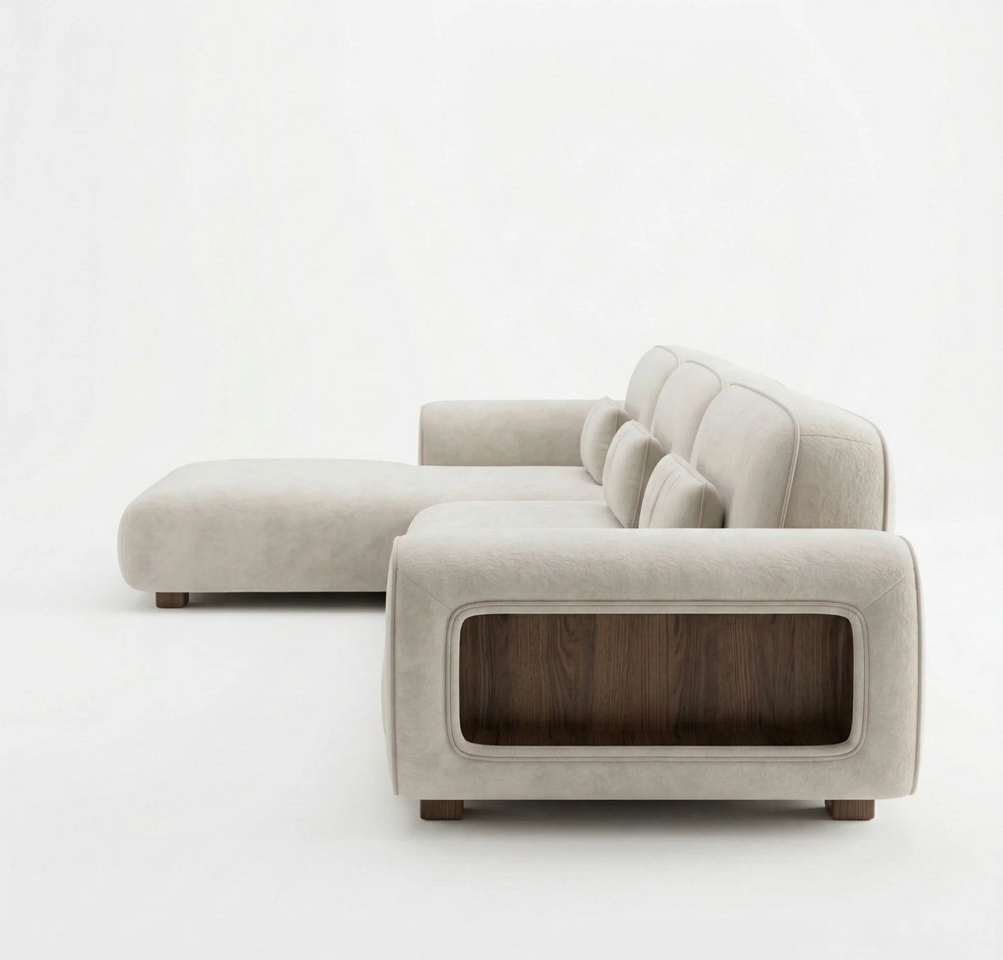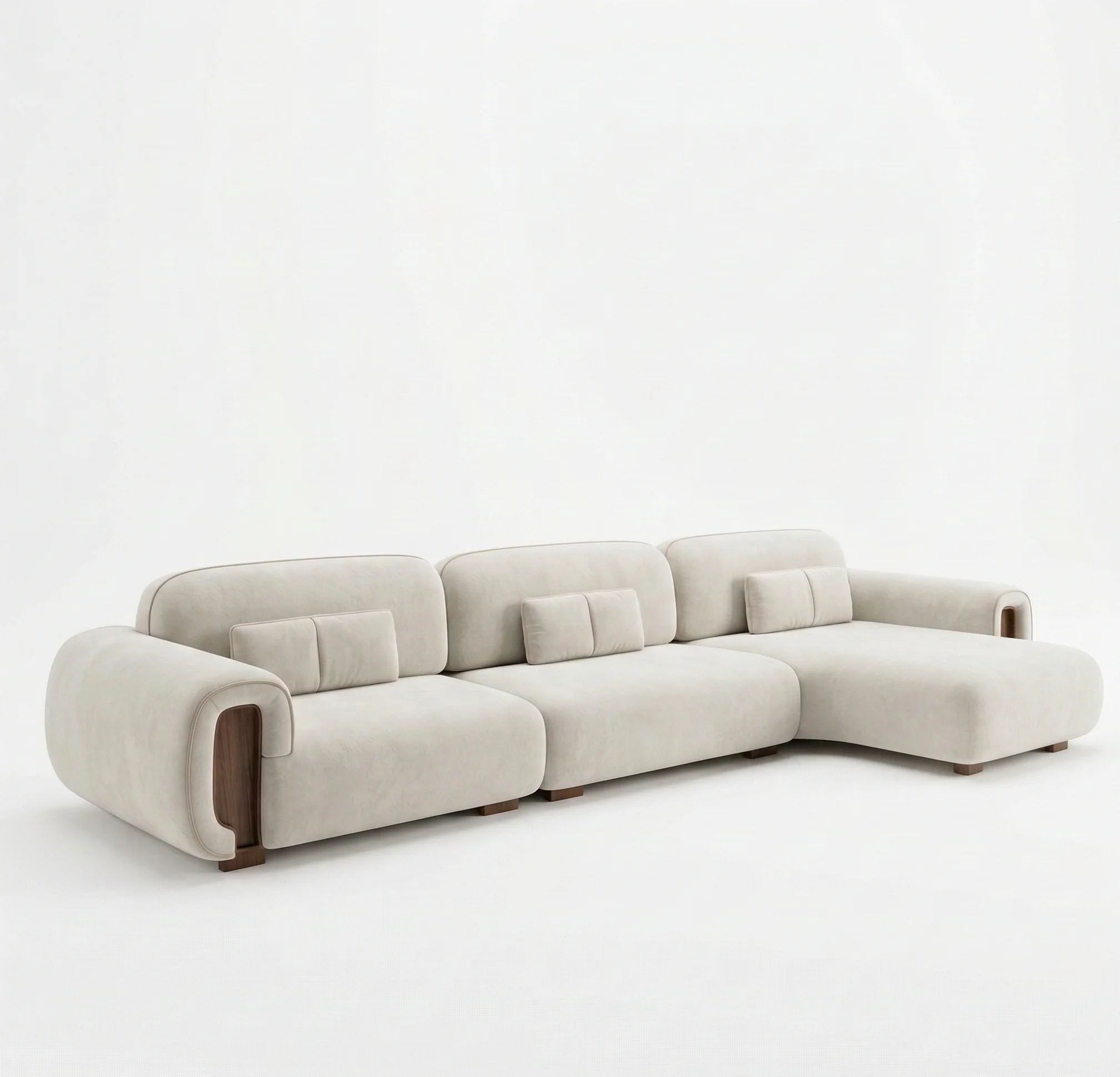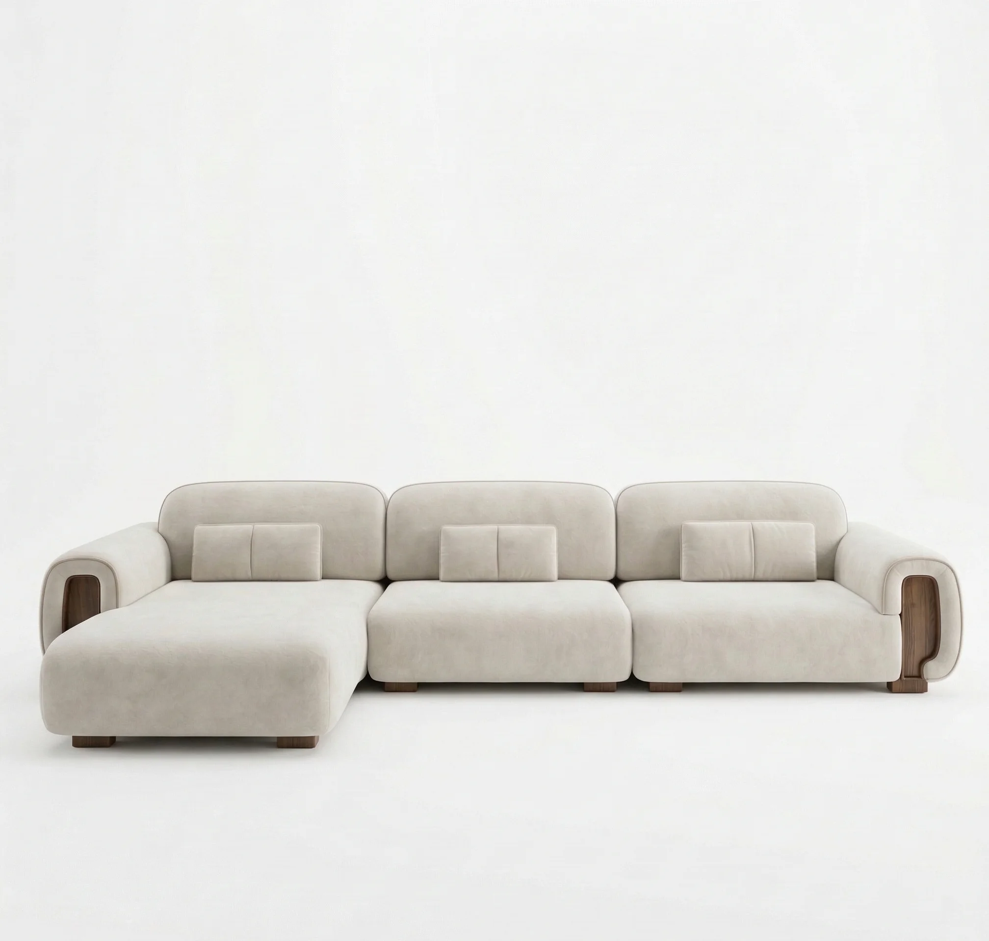 Redefine your lounge with our Ivory modular sectional. Perfectly blending Japandi minimalism with modern luxury, this piece stands out with its hand-finished wooden block legs and signature armrest inset panels.