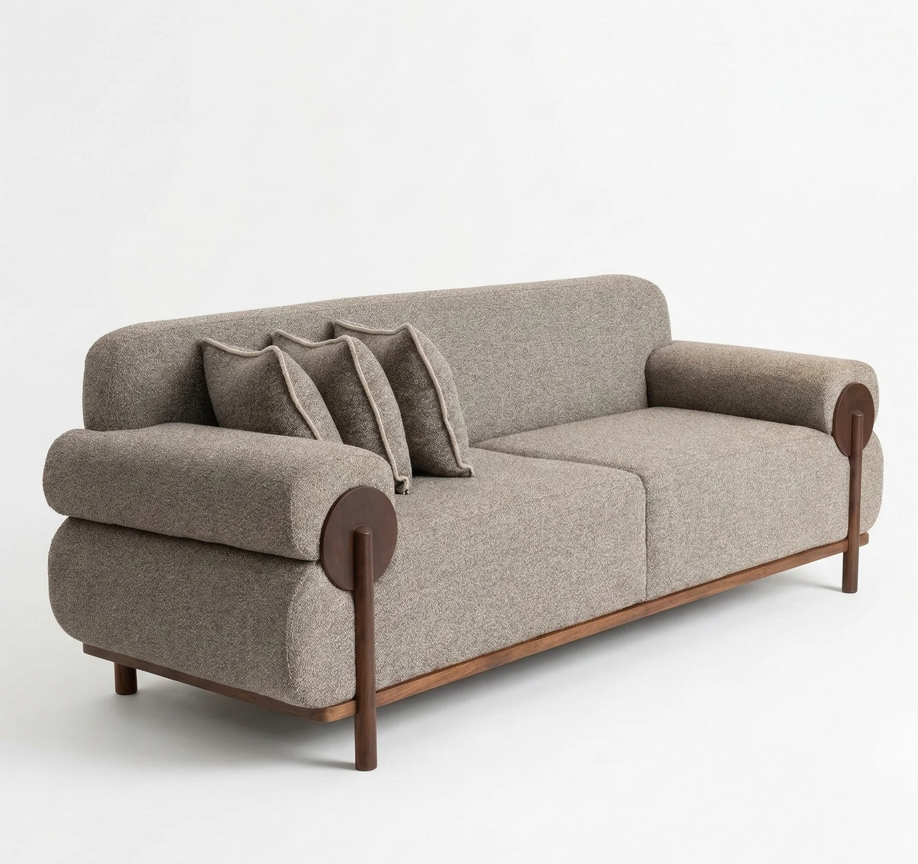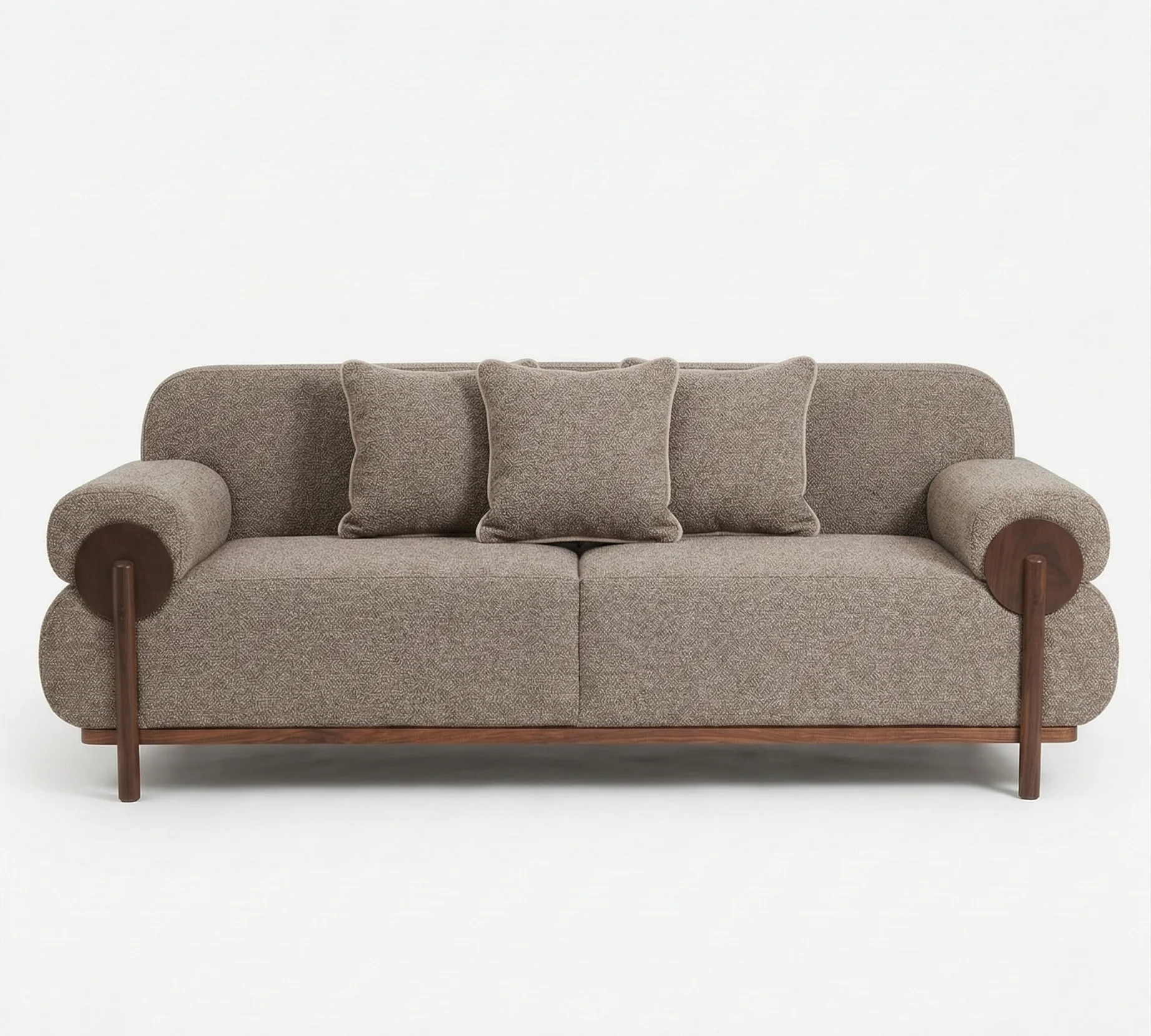 Our Mocha Taupe designer sofa stands out with its innovative wood-accented armrests and minimalist silhouette.