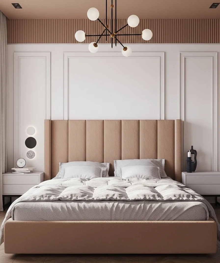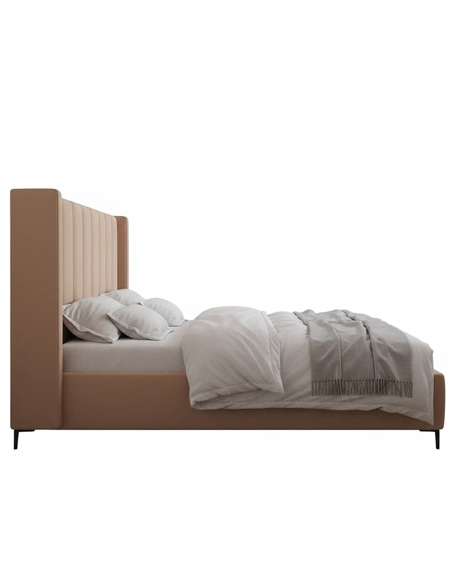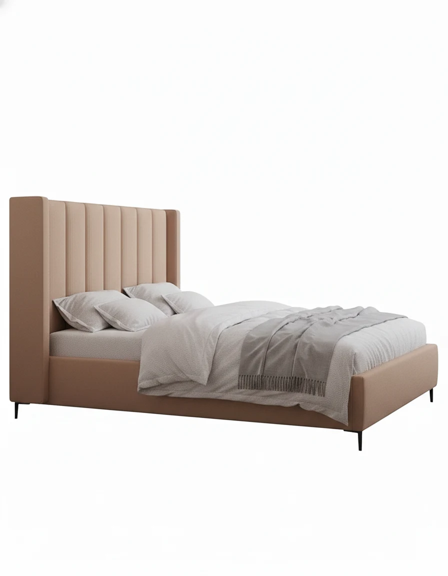 Bring a touch of modern elegance to your bedroom with this stunning upholstered bed. The standout feature is the high wingback headboard, which features clean, vertical channel tufting that adds both height and texture to your space.