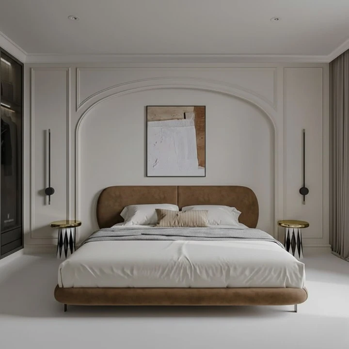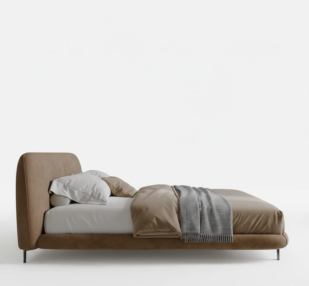 Minimalist Tan Upholstered Bed with Soft Curves