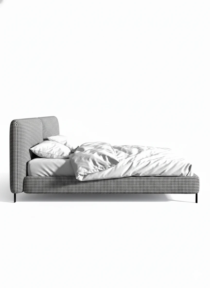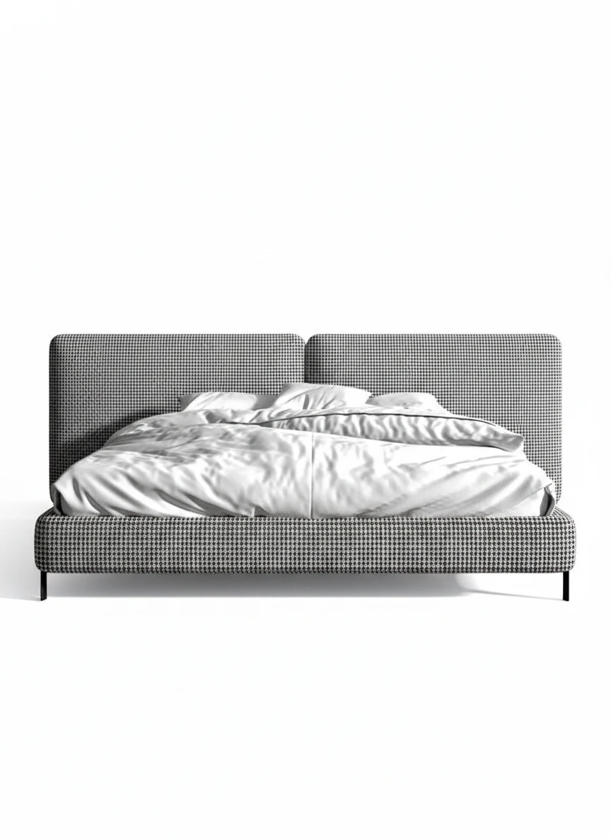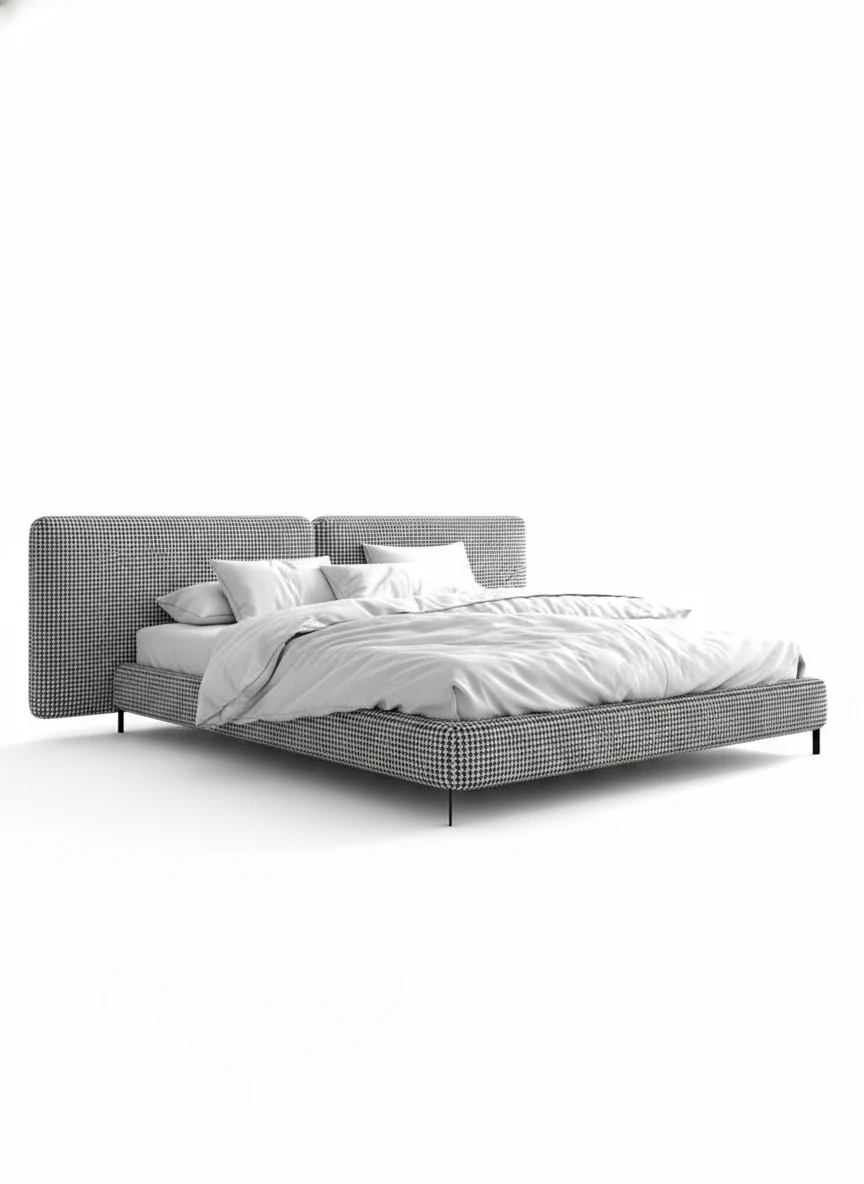 This chic and modern bed features a striking black and white checkered pattern on the upholstery, offering a bold yet elegant aesthetic for any bedroom. With its clean lines and minimalistic design, it effortlessly blends into contemporary spaces. The slim black metal legs add a touch of sophistication, making it an eye-catching centerpiece.