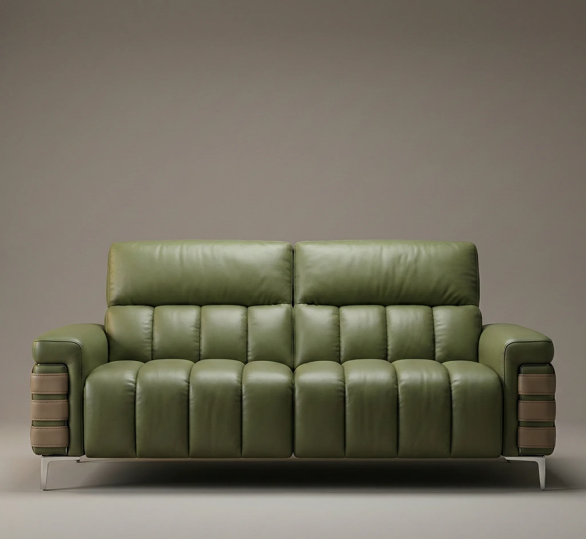 Make a powerful impression with the Veridian. This masterpiece features meticulously vertical-channeled quilting that creates a rhythmic, architectural silhouette. Upholstered in a rare Olive Green premium leather, it is detailed with signature tan leather straps on the armrests for a touch of bespoke craftsmanship.
