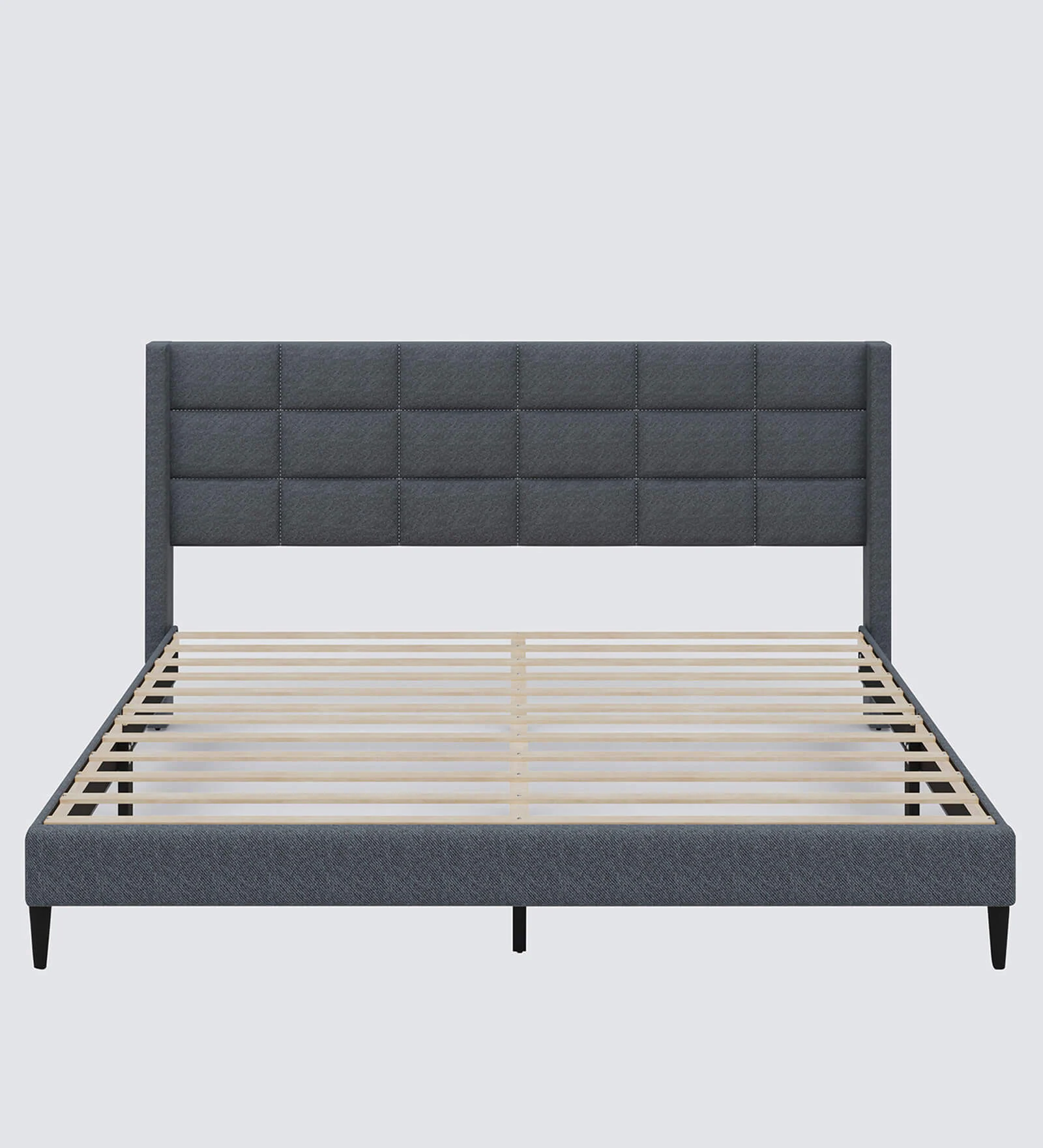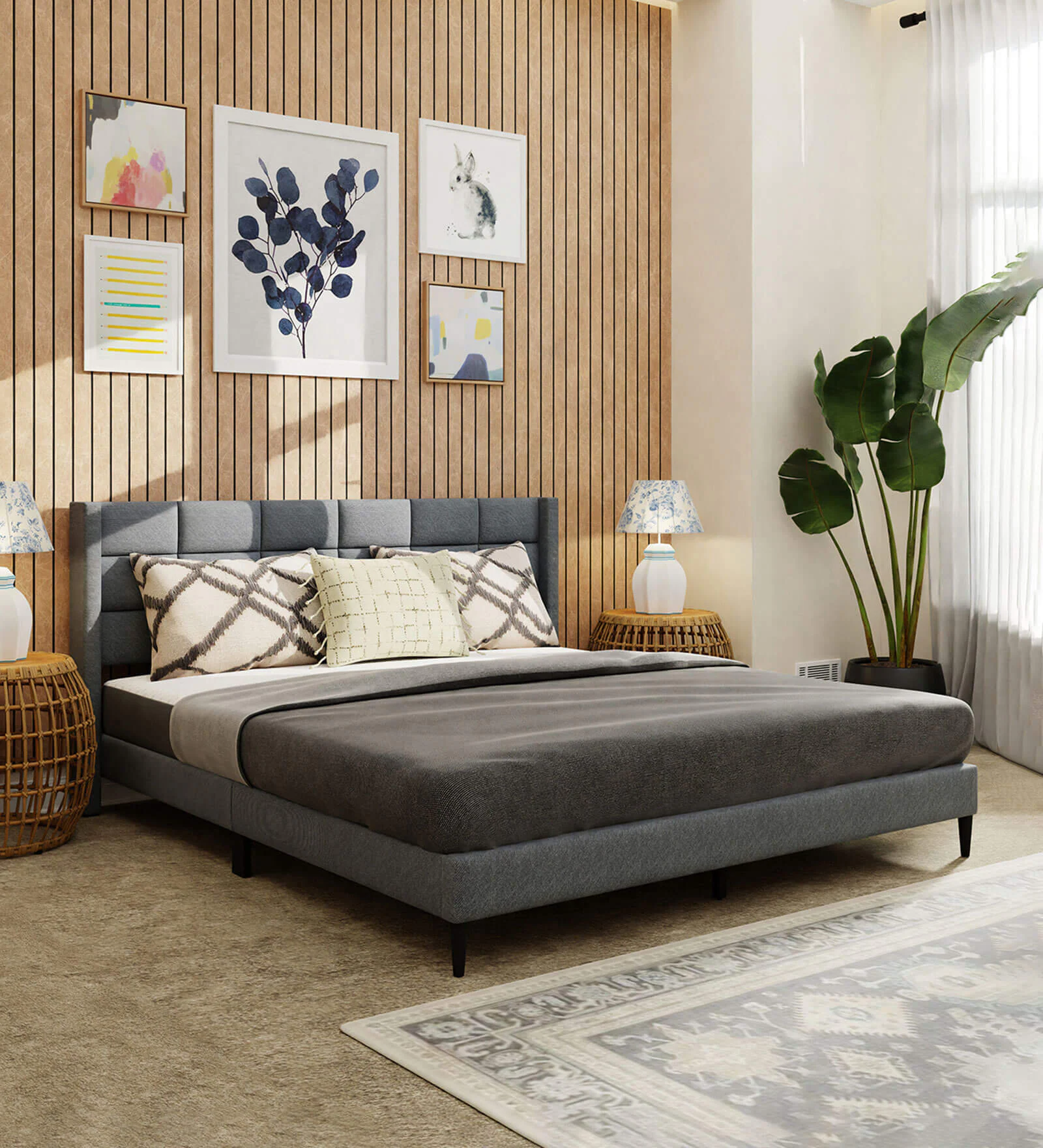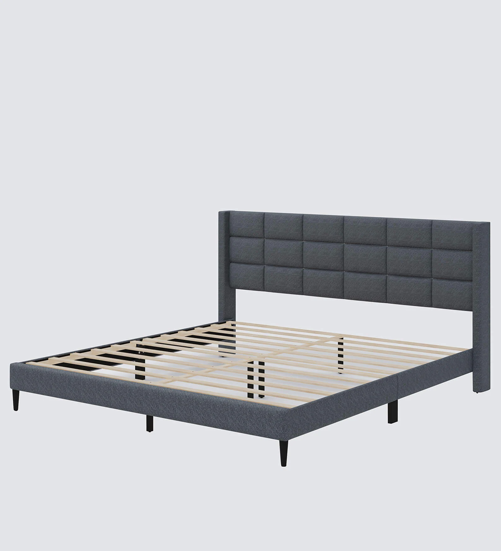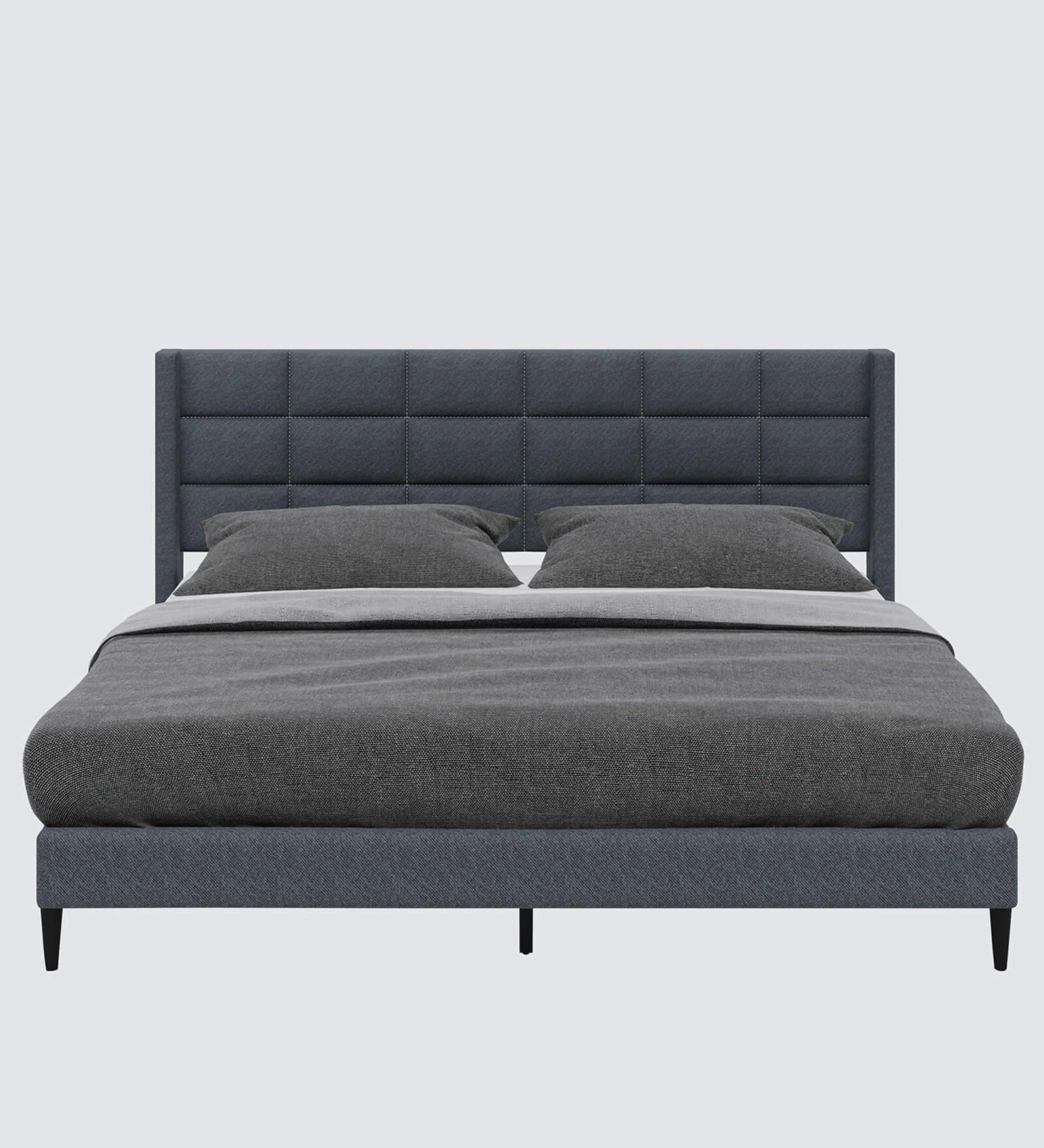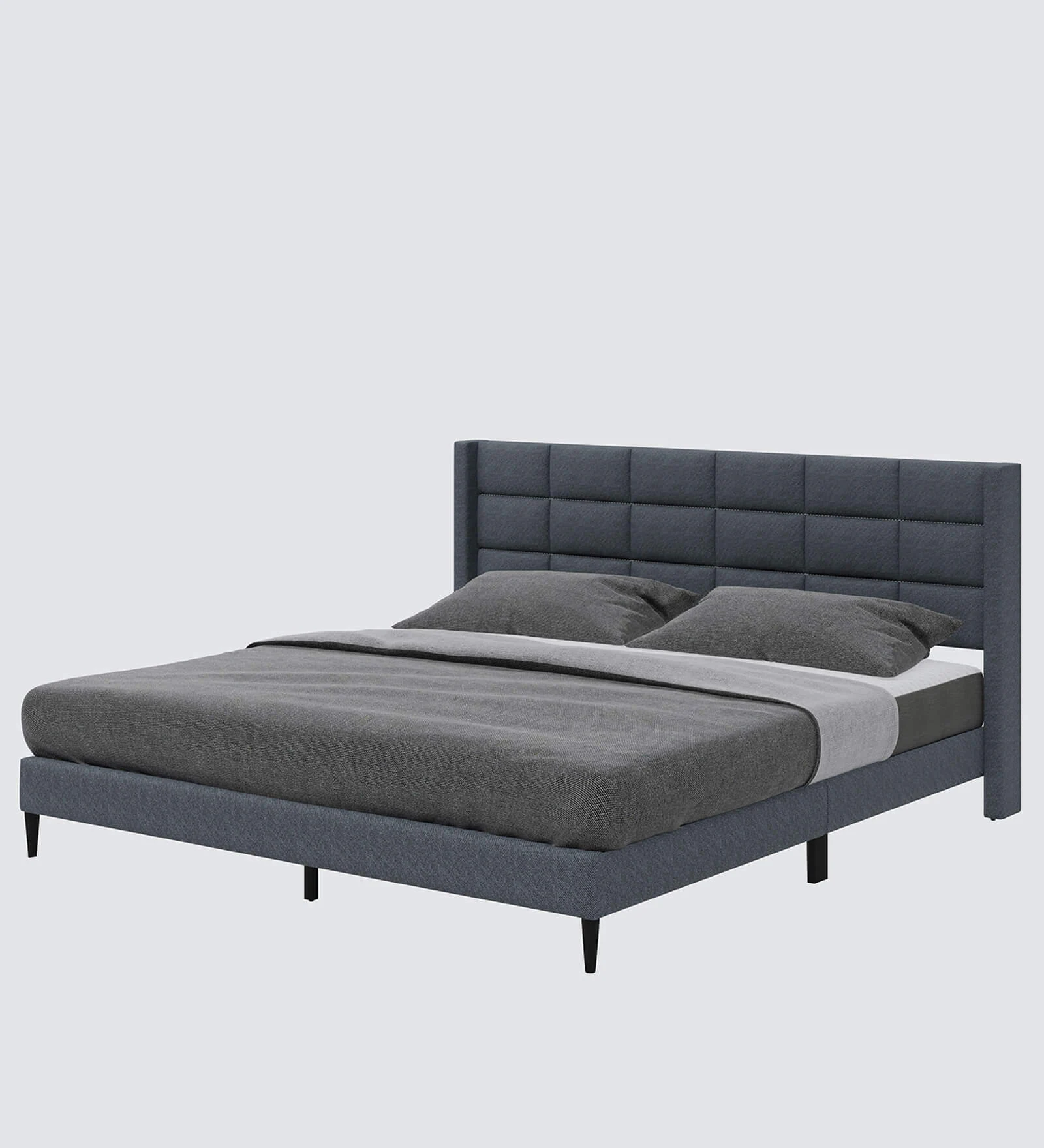 Its highlight is the tall, wingback-style headboard adorned with a classic grid-patterned tufting, providing a plush surface to lean against while you read or relax in bed. Supported by sleek, tapered legs, the frame sits slightly off the ground, giving it a light, contemporary appearance that fits seamlessly into any modern Indian home.