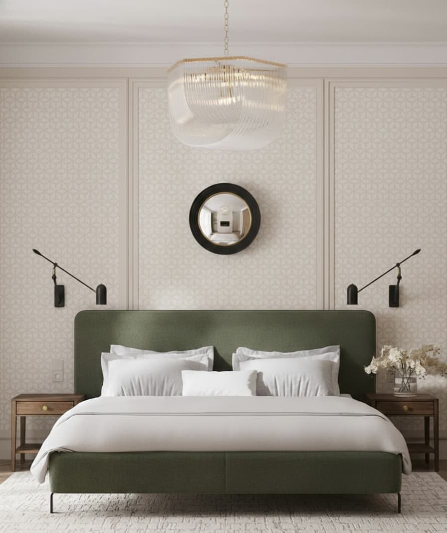 This bed is all about that “less is more” vibe with a pop of earthy color. The rich sage green upholstery brings a calm, nature-inspired feel to the room, making it look super fresh and modern. It features a clean, rectangular headboard with soft rounded corners and sits on sleek, slim black metal legs that give it a “floating” effect, keeping your space looking open and clutter-free.