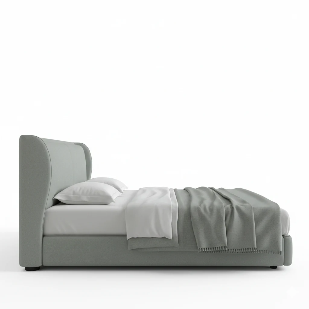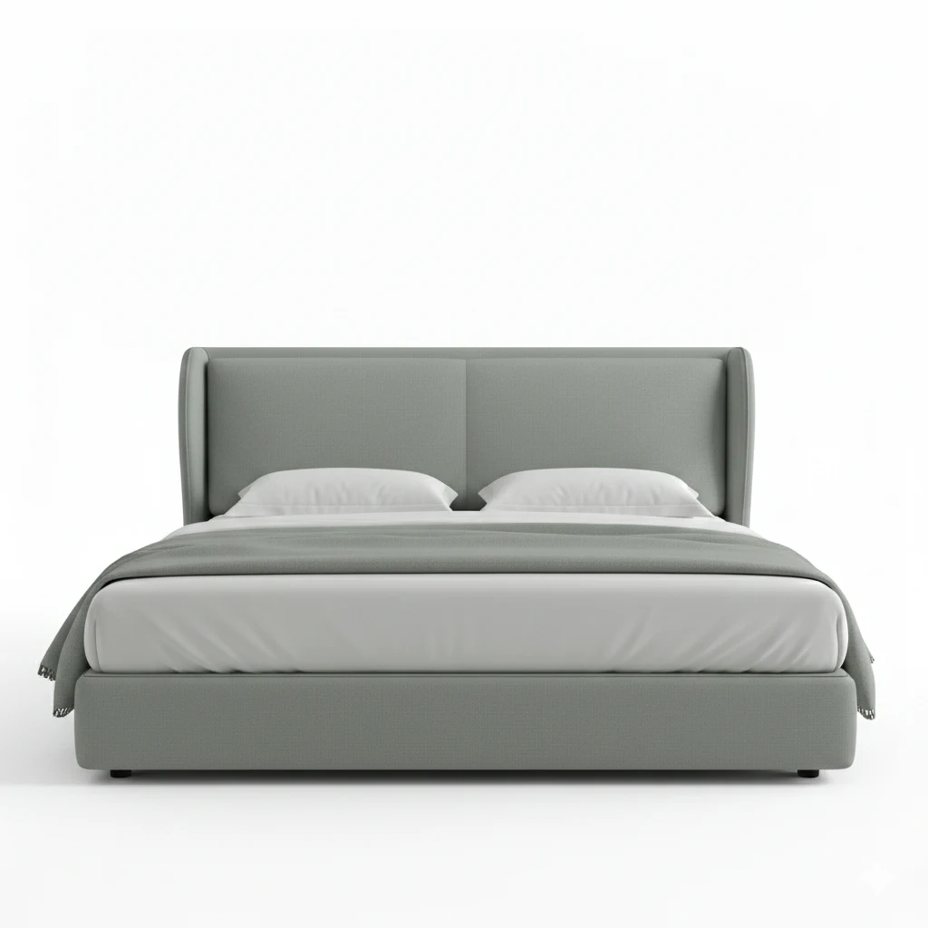 This beautiful soft green upholstered bed features a sleek, modern design with a high-back headboard that offers both style and comfort. The clean lines and minimalistic form make it an ideal choice for creating a calming, serene bedroom environment. The smooth fabric and gentle curves add a touch of elegance to any contemporary setting.