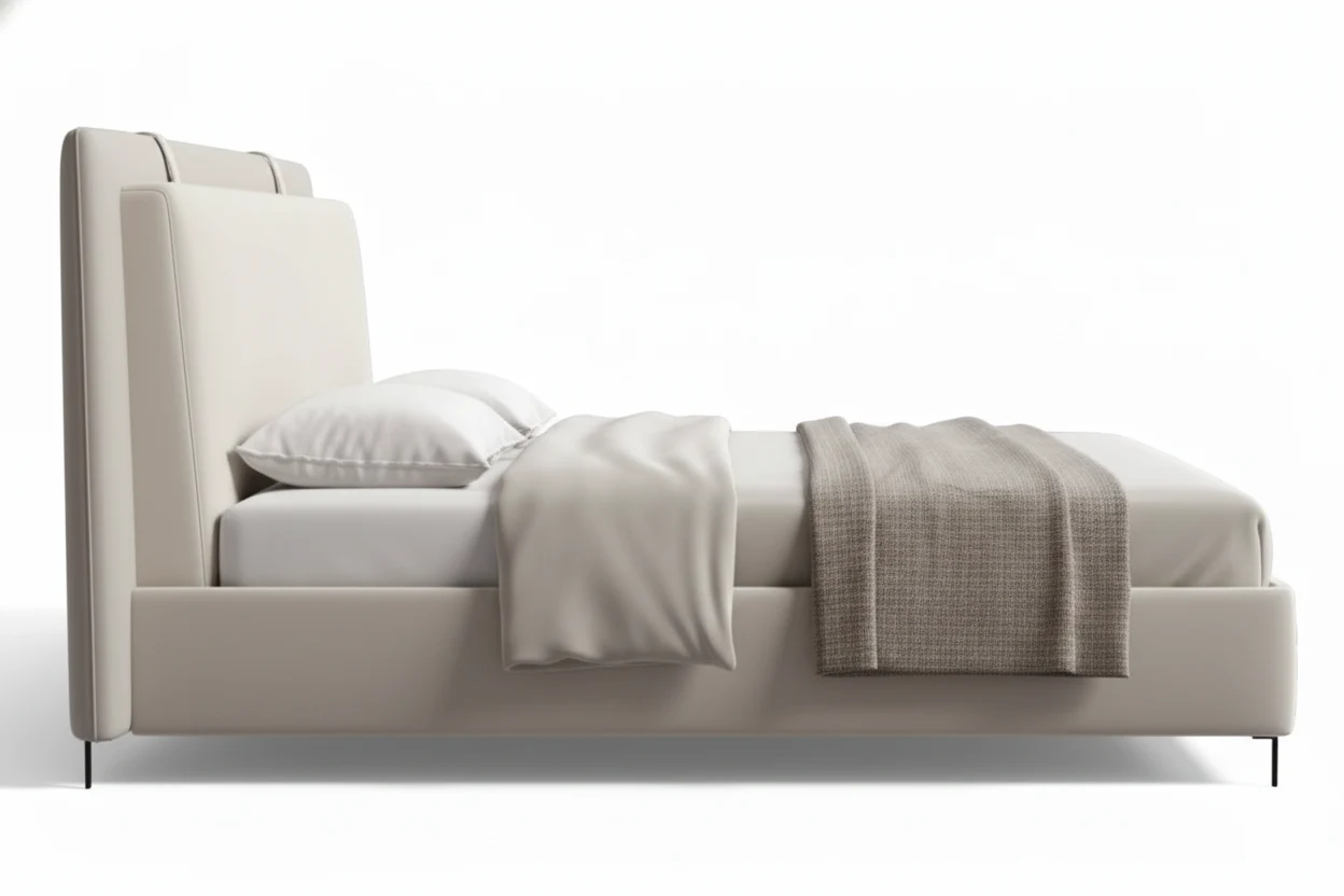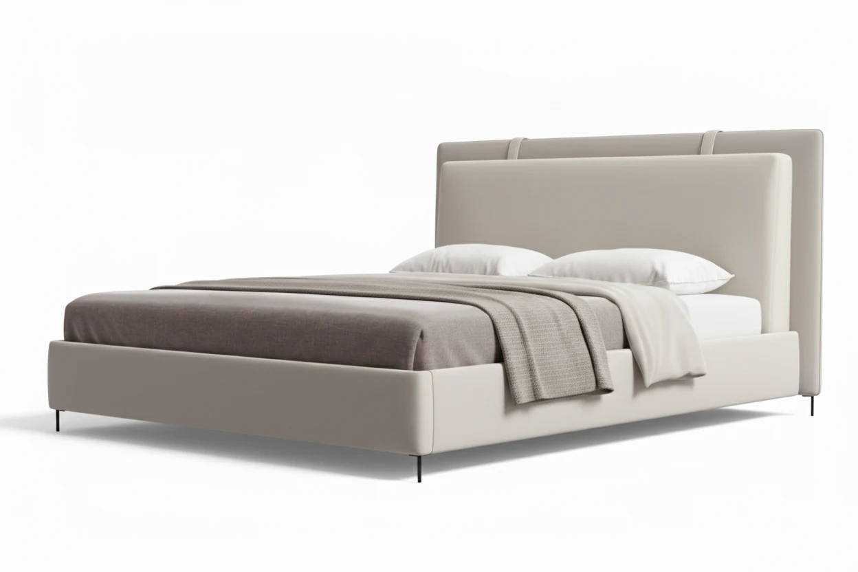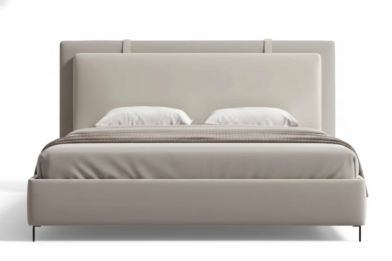 This piece is the definition of “less is more” but with a clever, stylish twist. It features a unique dual-layered headboard in a creamy beige tone that adds depth without making the room feel heavy. The standout detail is the pair of sleek vertical straps that wrap over the front panel, giving it a high-end, contemporary look.