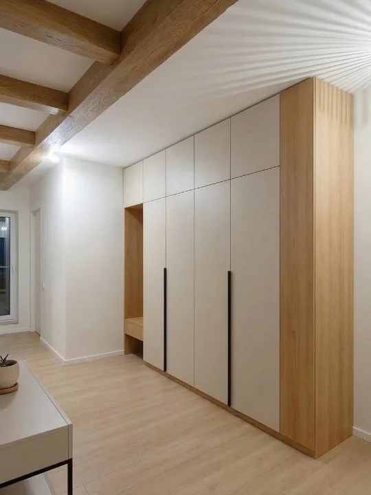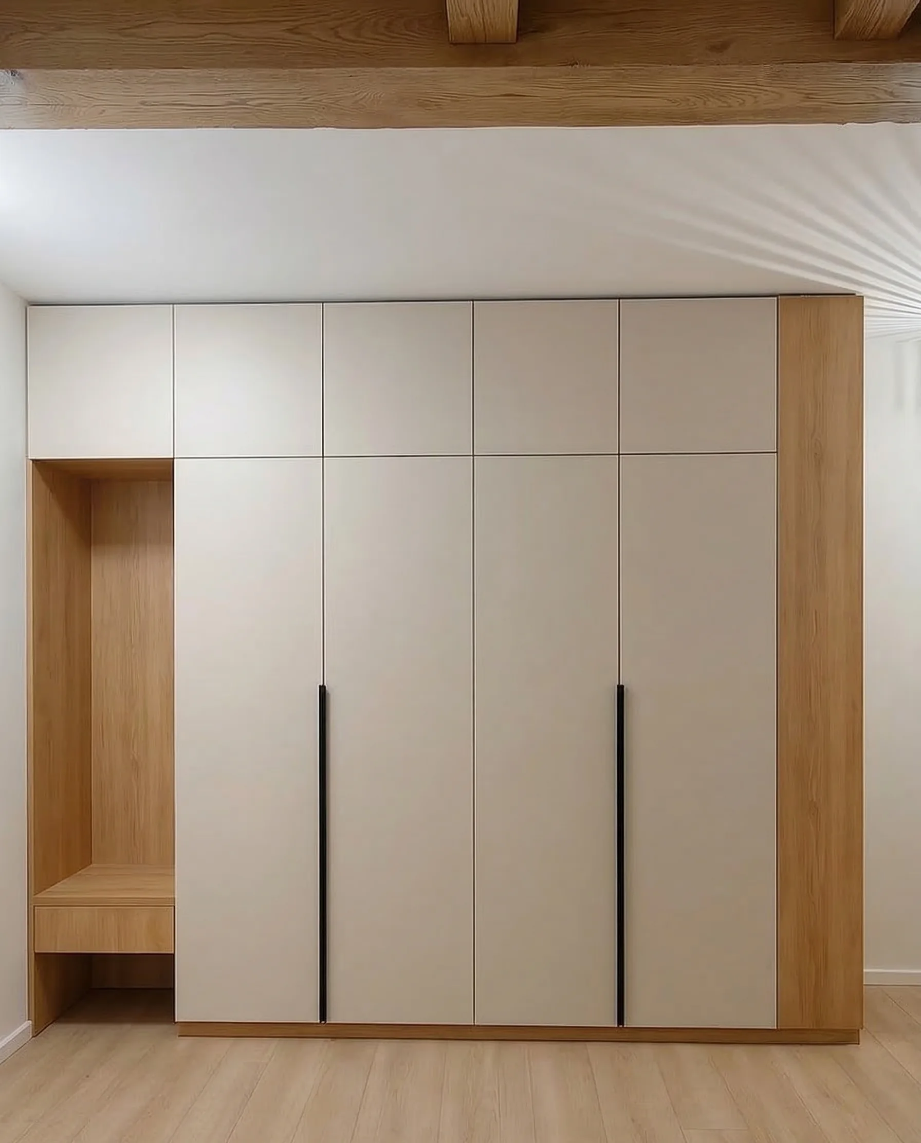 Redefine your hallway or master suite with a wardrobe that acts as a functional anchor. The Junction System features seamless matte cashmere panels nestled within a robust oak-grain frame. The standout feature is the integrated open valet nook, providing a dedicated space for sitting, stowing daily-use bags, or prepping your next day’s attire.