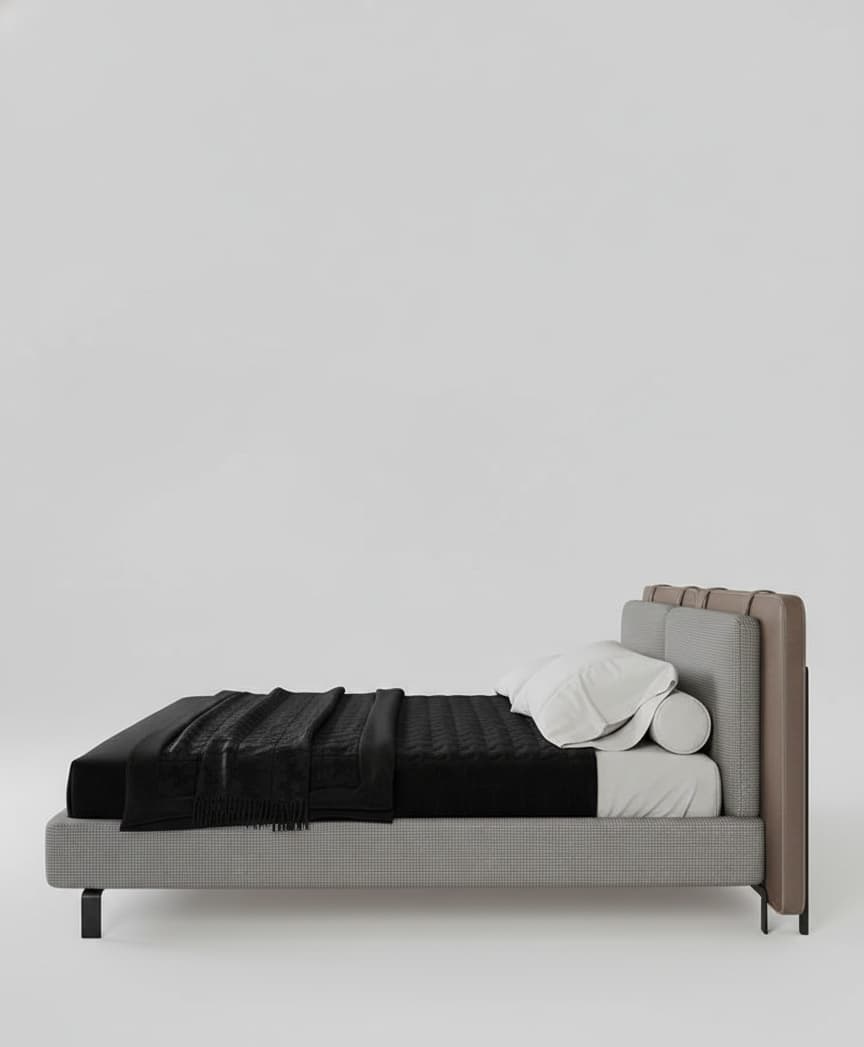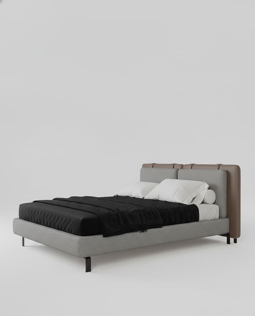 This bed rocks a sleek gray fabric headboard with those clean quilted panels that look sharp against any wall, topped with fluffy white pillows and a bold black throw for that edgy touch. Slim black legs lift the low platform just right, keeping dust bunnies away while feeling super modern and open. Perfect for city nights when you want comfort without the bulk.