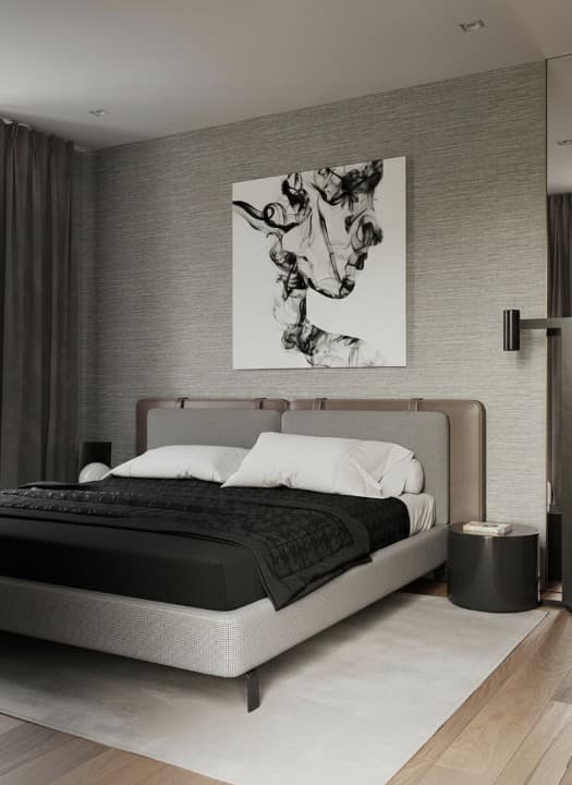 In Ahmedabad homes, this gray vibe stays cool in our heat and pairs easy with light walls or dark art like that smoky print nearby. Toss on brighter throws for Diwali or keep it moody year-round—hides wear well and feels luxe after long workdays. That simple style makes your room look put-together without trying too hard.